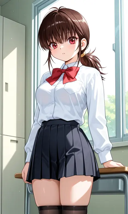 오자와 카요(수큐슈 쇼조), 긴 머리, 낮은 포니테일, 중간 길이 포니테일, 노란 리본으로 묶인 포니테일, 양쪽 측면 앞쪽의 머리카락, 눈 사이의 머리카락, 갈색 머리, 붉은 눈, 중간 크기의 가슴, 허벅지, 긴 소매 셔츠, 흰색 긴 소매 셔츠, 학교 유니폼, 흰색 학교 유니폼, 빨간 리본 넥타이, 치마, 검은 치마, 짧은 치마, 검은 짧은 치마, 허벅지 길이 양말, 검은 허벅지 길이 양말