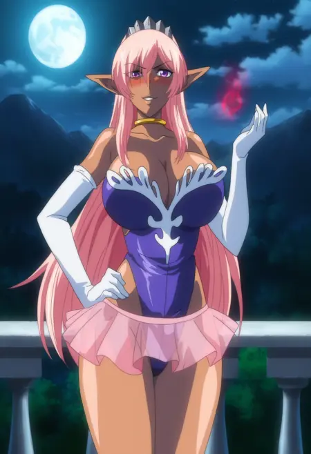 NinaAslato, 1girl, elf, dark-skinned female, dark persona, pink hair, long hair, purple eyes, tiara, golden choker, purple leotard, elbow gloves, pink microskirt, see-through