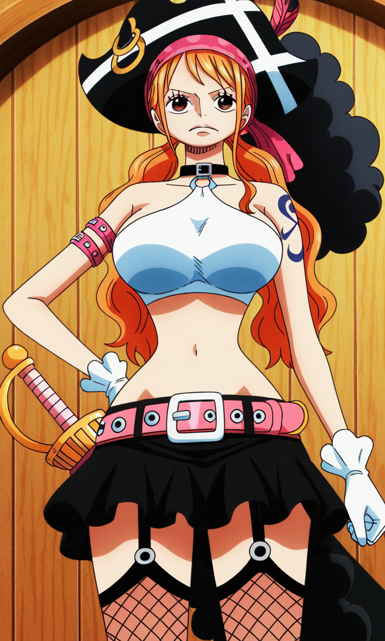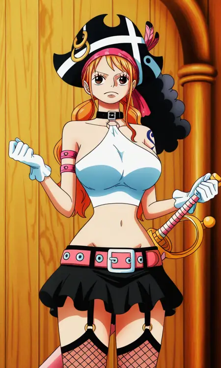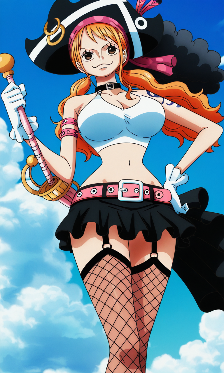 ナミ(ワンピース)、1人 girl、一人、オレンジ色の髪、長い髪、茶色の目、海賊の帽子、フィッシュネットの太ももハイ、太ももストラップ、黒いスカート、ツインテール、黒いカラー、白い服、黒いカラー、Oリング、ハーネック、白いクロップトップ、アンダーブスト、ガーター、白い手袋、お腹、ピンクのベルト、ピンクの剣、ミニスカート、へそ、肩出し、羽、大きな胸