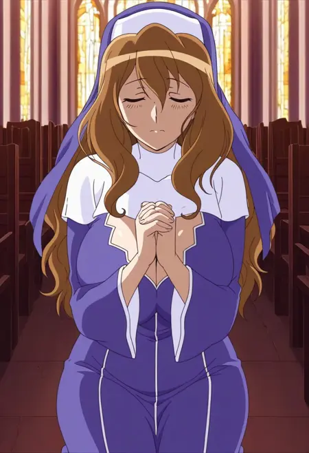 Harumi kurisu, purple eyes, brown hair, long hair, nun outfit, large breasts