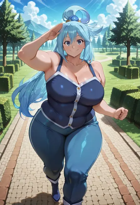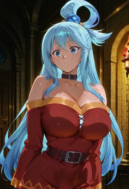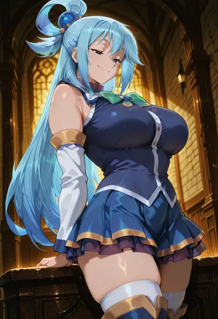 aqua(konosuba), long hair, blue eyes, hair ornament, very long hair, blue hair, hair rings, single hair ring, hair bobbles, mature female, breasts, anime screencap,