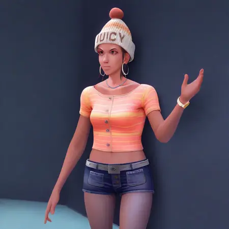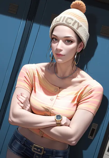 縞模様のシャツ、お腹が出るデザイン、デニムショートパンツ、フープイヤリング、ネックレス、ジュエリー、腕時計