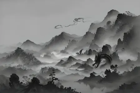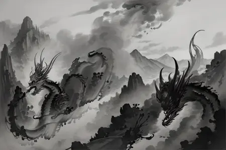 {best quality}, long(v1.0)/LONG(v2.0), chinese ink painting, super huge dragon, solo, lora:泼墨中国龙-molong:0.9, lora:Moxin\_Shukezouma:0.75, lora:shuimobysim-Moxin\_1010:0.3, very detail, mountain, clouds and mist, greyscale,