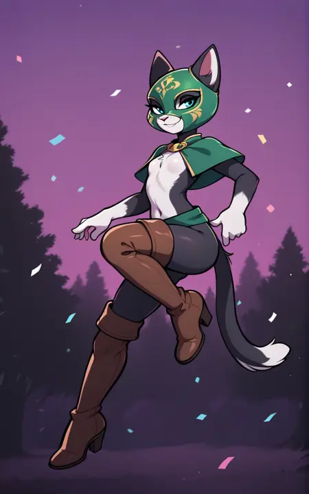 복장: 허벅지 길이 양말, 하이힐, 부츠, 허벅지 부츠, 갈색 신발, 벨트, 녹색 마스크, 마스크 또는 무마스크, 카프레**