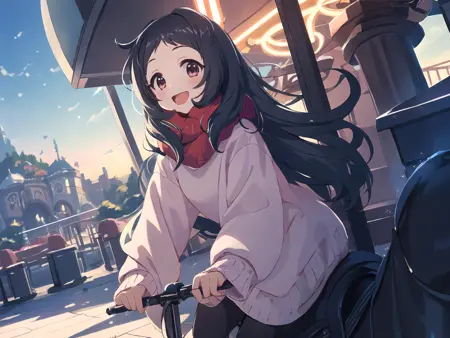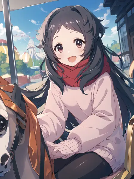 现实生活造型:MiyakoReal,黑色头发,棕色眼睛,红色围巾,粉色毛衣,黑色连裤袜;
