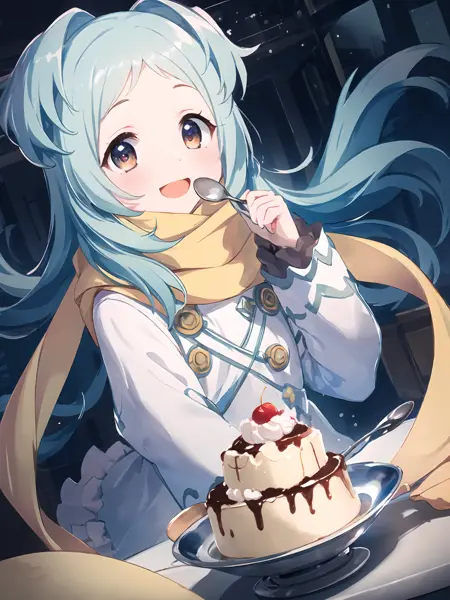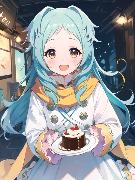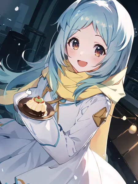 默认服装:MiyakoDefault,黄色围巾,白色连衣裙,纽扣,荷叶边,袖子过腕,黑色连裤袜,(靴子);