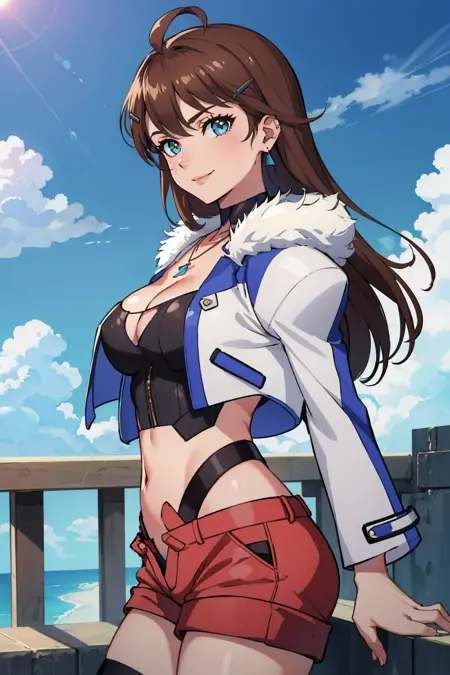 添加 "xs3Shion, hairclip, earring, necklace, blue and white jacket, fur trim, black crop top, cleavage cutout, pink shorts, black thighhighs, sneakers" 以获得她在《异度传说》第三集的造型。