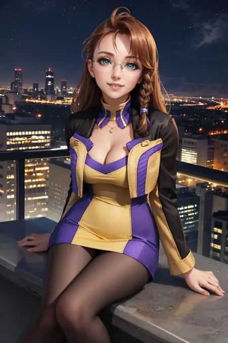 Add "xs1Shion, braid, glasses, yellow jacket, cleavage, purple and yellow dress, pantyhose, yellow boots" for her Xenosaga I look.