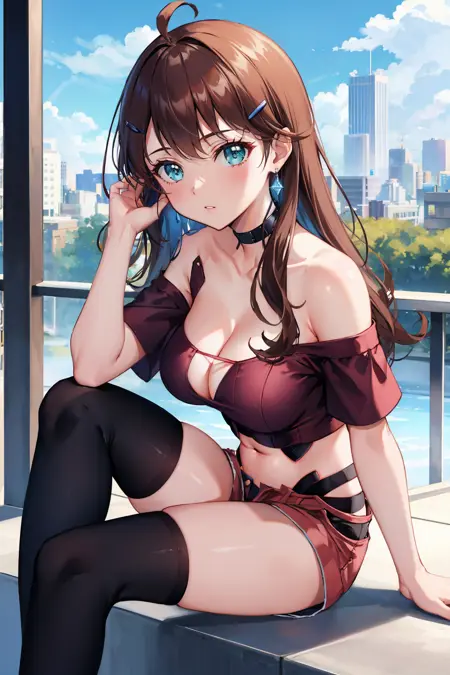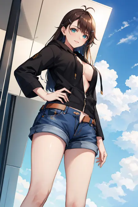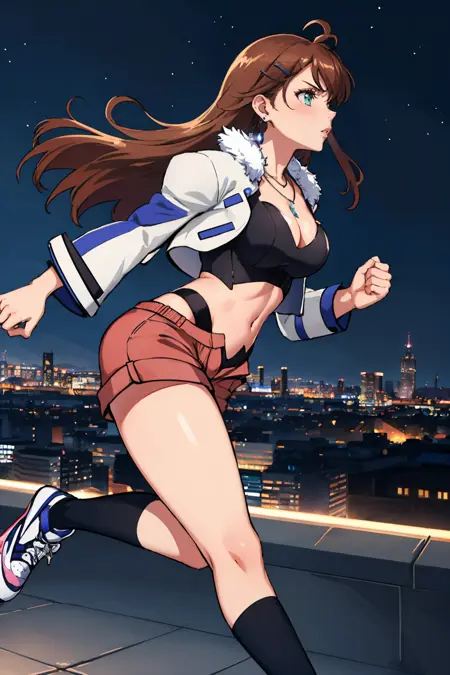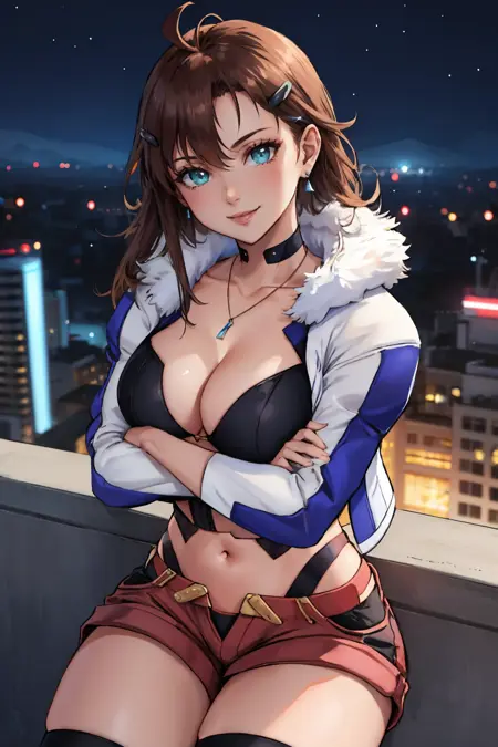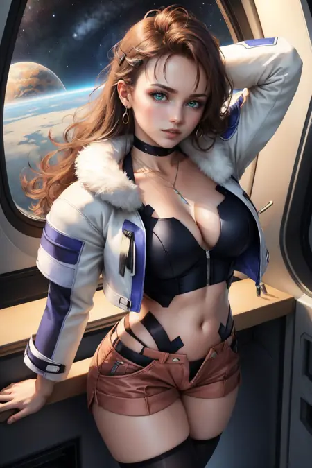 Add "xs3Shion, hairclip, earring, necklace, blue and white jacket, fur trim, black crop top, cleavage cutout, pink shorts, black thighhighs, sneakers" for her Xenosaga III look.