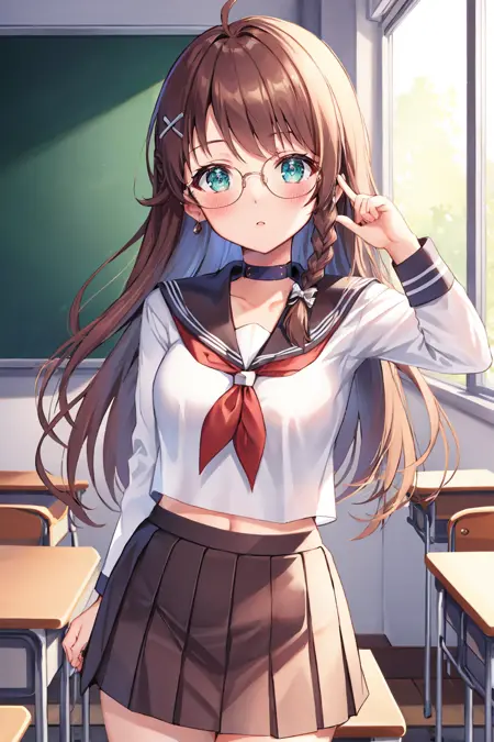 添加 "xs1Shion, braid, glasses, yellow jacket, cleavage, purple and yellow dress, pantyhose, yellow boots" 以获得她在《异度传说》第一集的造型。