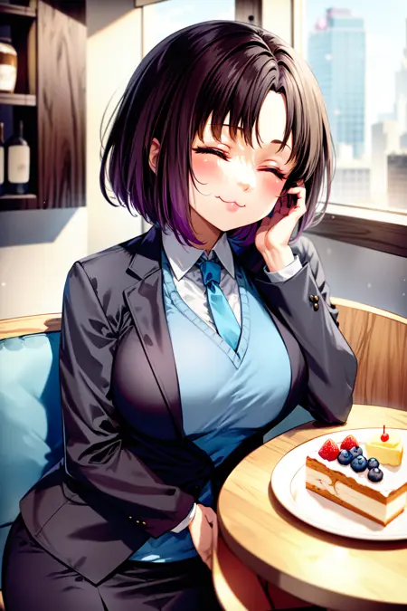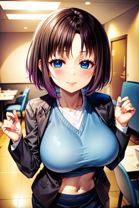 ElmaDragonMaid_NDV, 1girl, multicolored hair, black hair, large breasts, short hair, blue eyes, bussines suit, jacket, tie, skirt, shirt