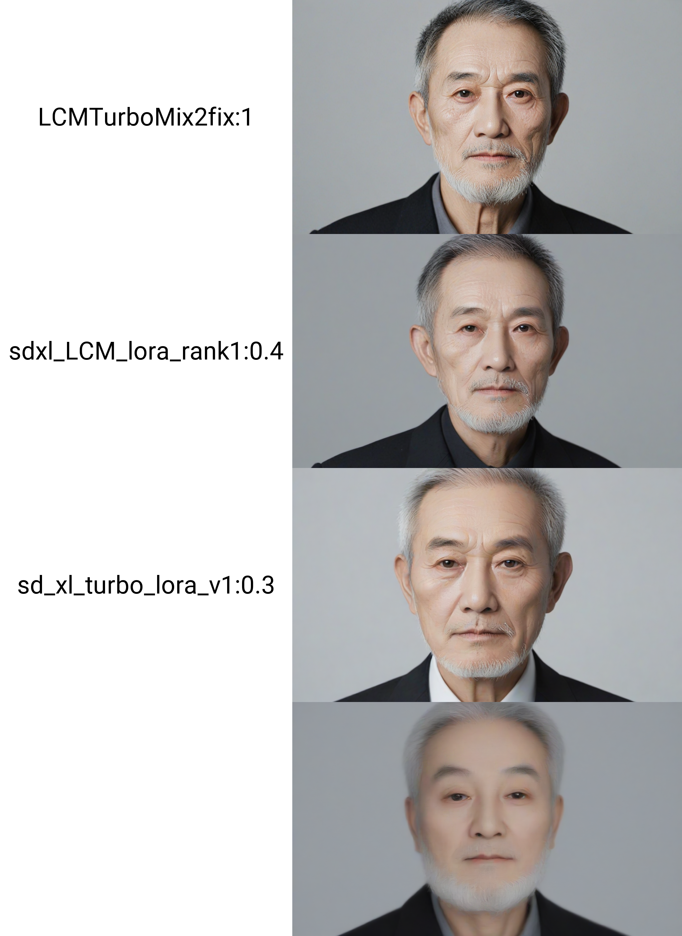 その結果、私が最適化したLCMとTurbo LoRAの融合比率でこのモデルを統合しました。このモデルのサイズはrank 1に縮小され、わずか12.3MBです。さらに、LORAの最適な重みは1に調整されています。使用が非常に簡単で、ぜひお試しください!