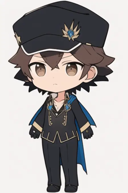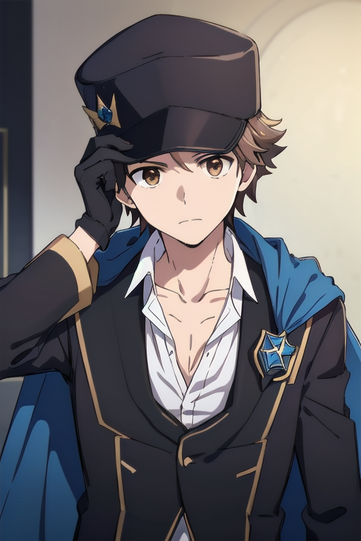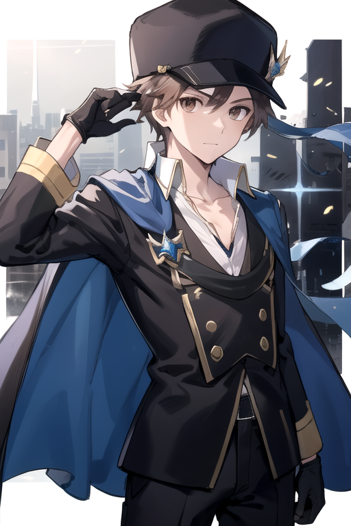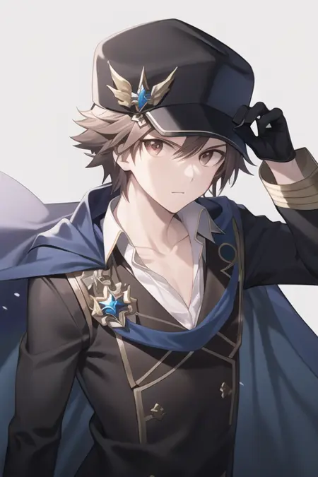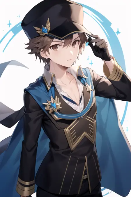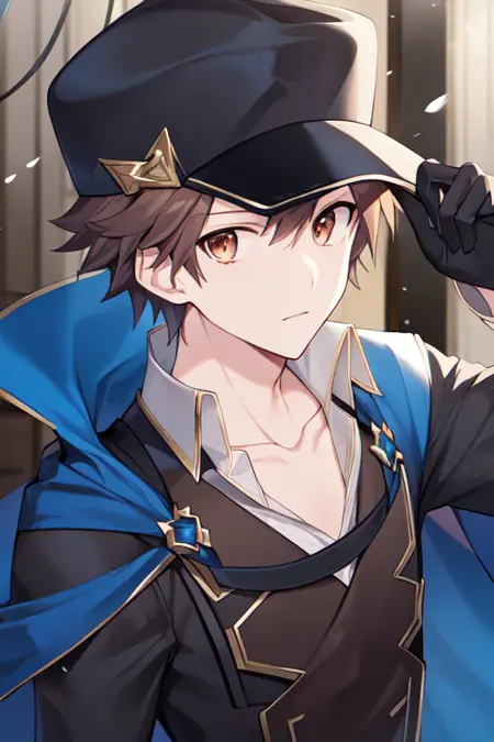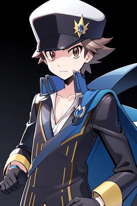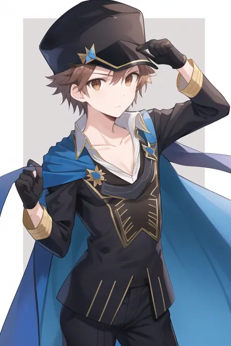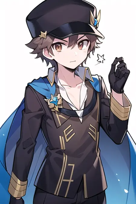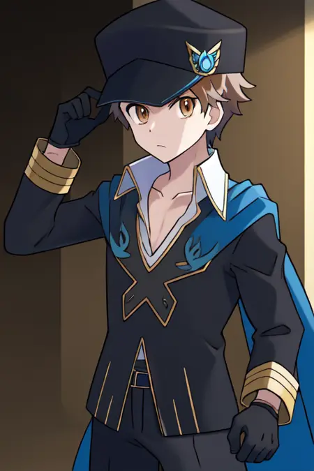 默认服装: red_neo_champion,棕色头发,棕色眼睛,黑色头饰,单人,黑色手套,露指手套,蓝色斗篷,帽子装饰,有领衬衫,白色衬衫,黑色夹克,黑色鞋子,