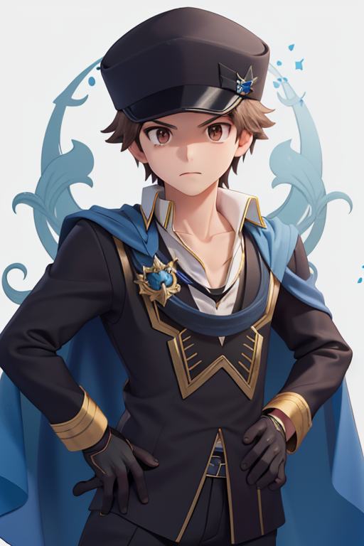 EX颜色: red_neo_champion,棕色头发,棕色眼睛,白色头饰,白色手套,露指手套,蓝色斗篷,帽子装饰,有领衬衫,蓝色衬衫,白色夹克,白色裤子,白色鞋子