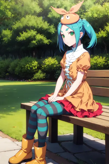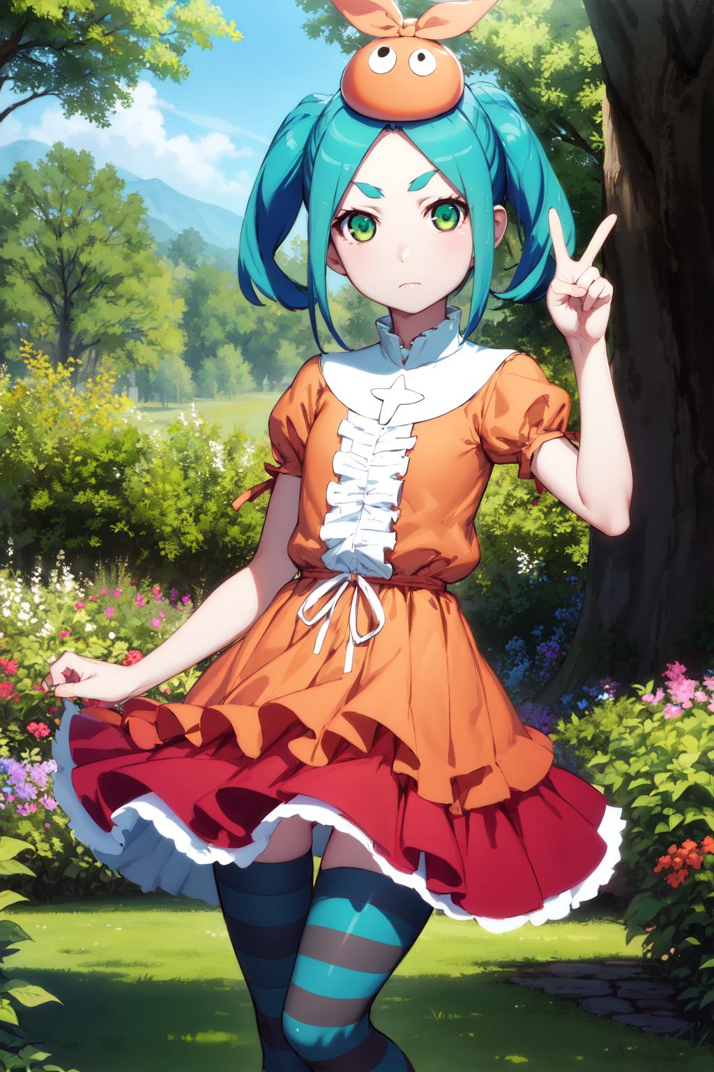ononokiyotsugi, aqua hair, short hair, green eyes, twintails, thick eyebrows, striped pantyhose, blue and gray pantyhose, dress, orange dress, white turtle neck collar, white frills, hat, puffy sleeves, short sleeves, rubber boots