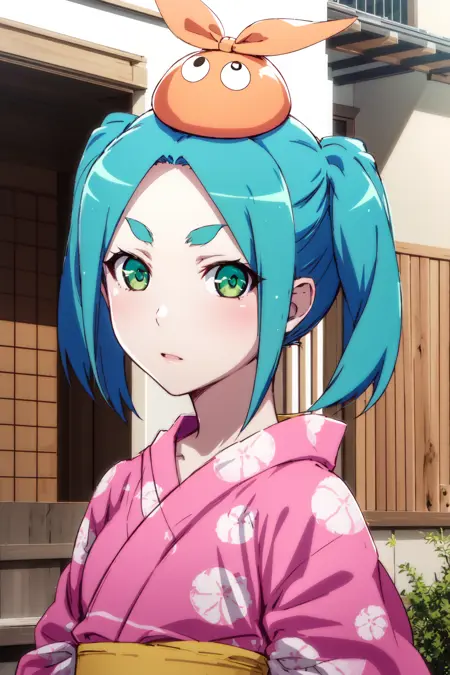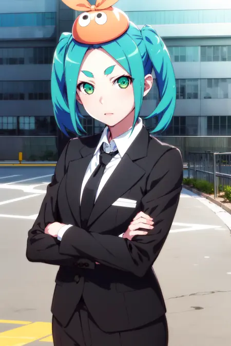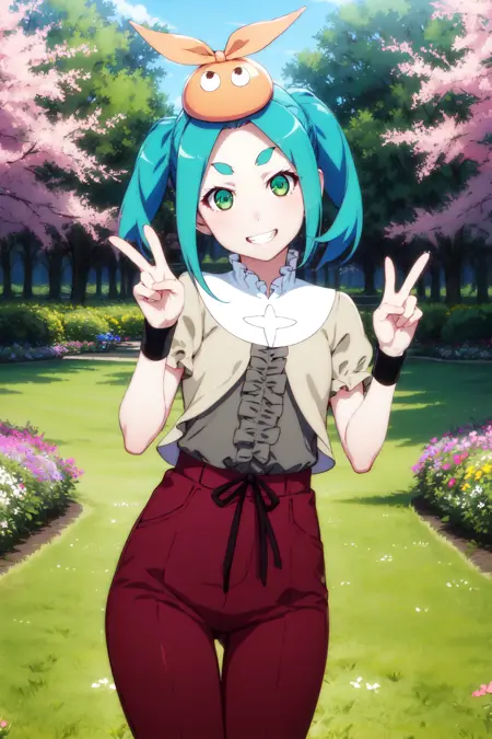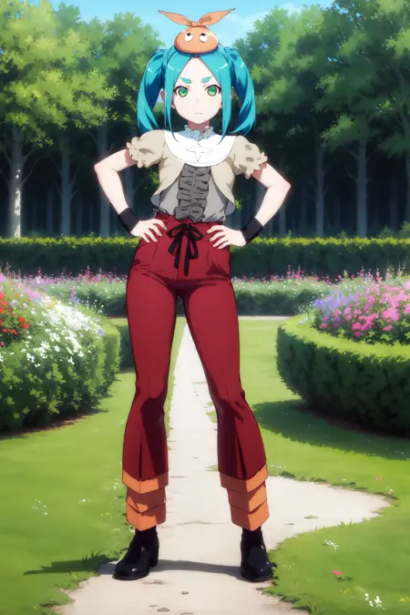 ononokiyotsugi, aqua hair, short hair, green eyes, twintails, thick eyebrows, brown cardigan, wristband, white turtle neck collar, gray frills, hat, short sleeves, red pants, black shoes