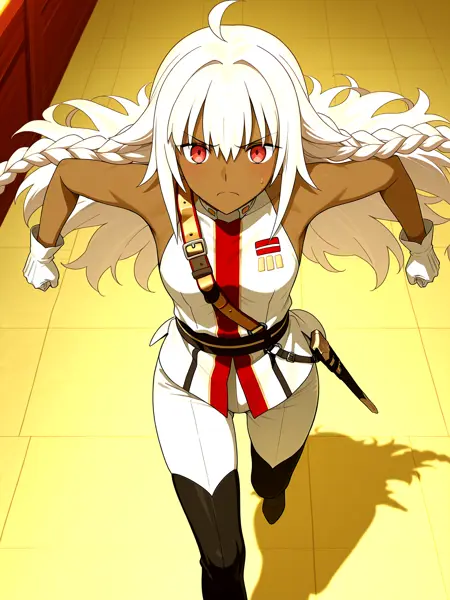 - 基本的な特徴:肌の色、赤い目、白い二つ編み、アホ毛 → 100%一貫性あり