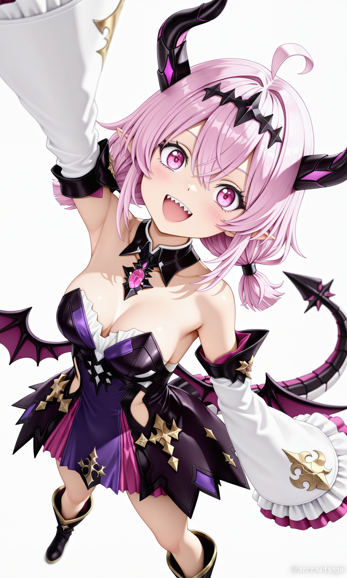 タグ: ロリ、角、ピンク髪、あほ毛、額に髪、短髪、低く編んだツインテール、ピンクの目、黒いティアラ、尖った耳、翼、ミニ翼、尾、大きな尾、太い尾、ゴールドの尾輪、ノーストラップドレス、黒いドレス、紫のドレス、多色のドレス、取り外し可能なカラー、胸の宝石、ボウタイ、取り外し可能な袖、広い袖、白い袖、指先より長い袖、裸の肩、ブーツ、裸の脚、鋭い歯