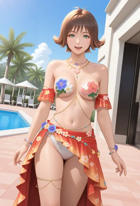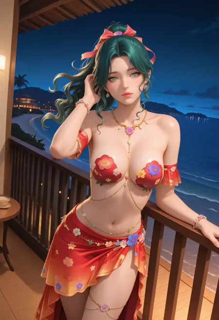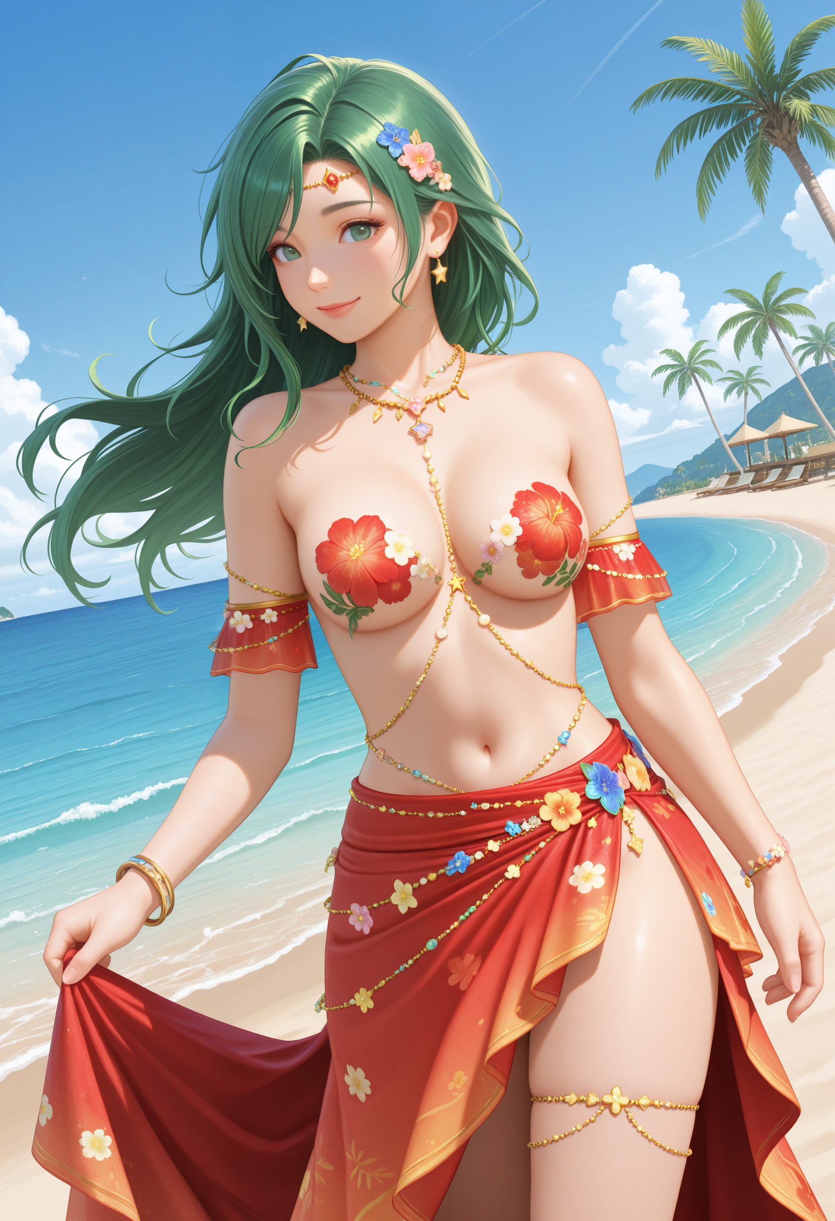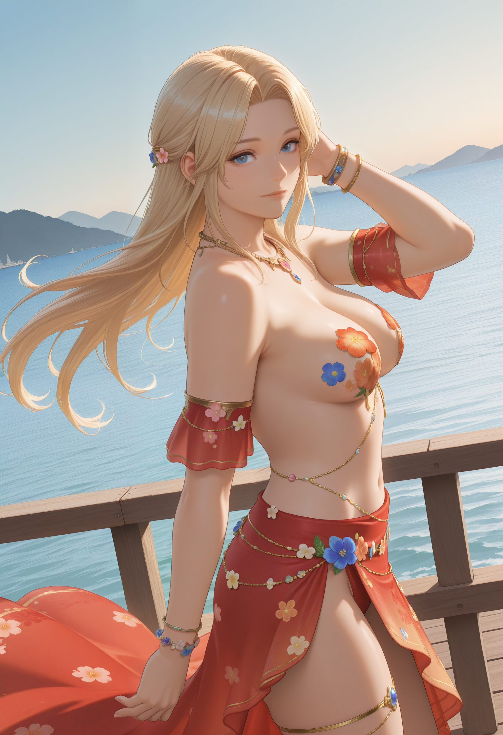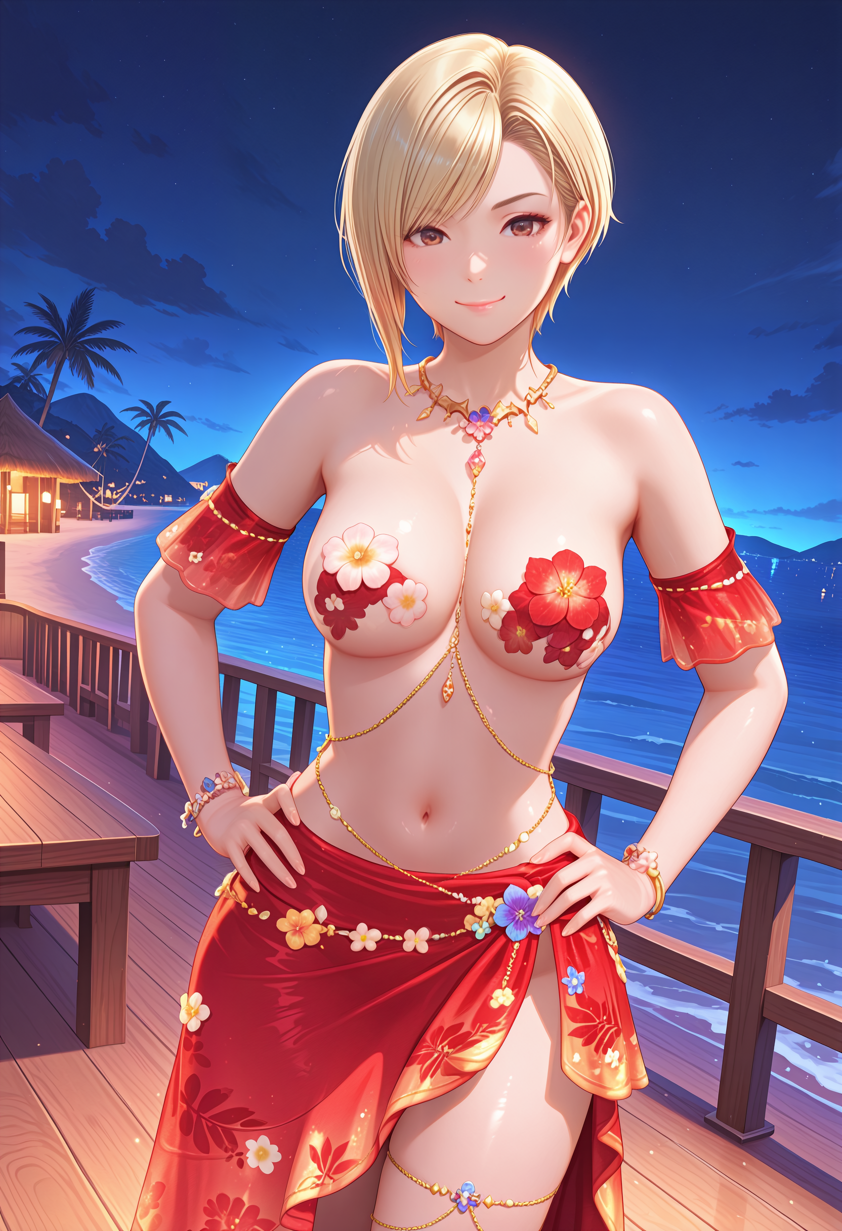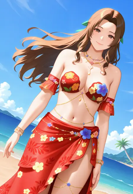 기본 프롬프트: "LalaVulpiaBule,flower bikini tops,strapless,necklace,detached sleeves,bracelet,body chains,floral print,flower,blue sarong,thigh chain,strappy heels"