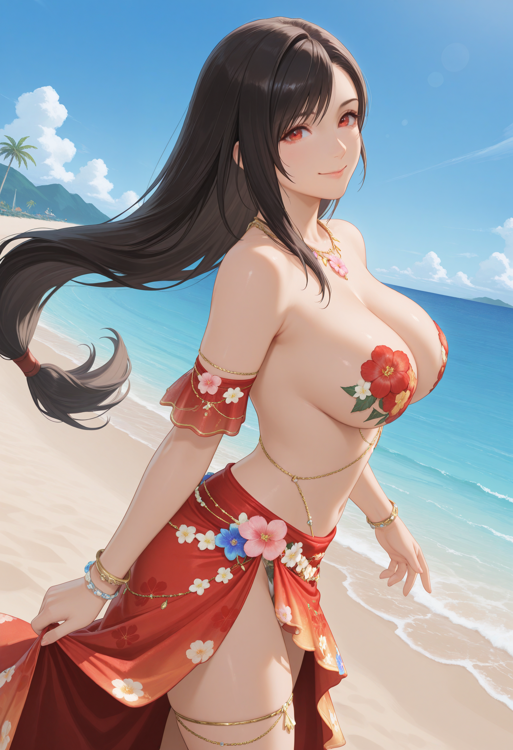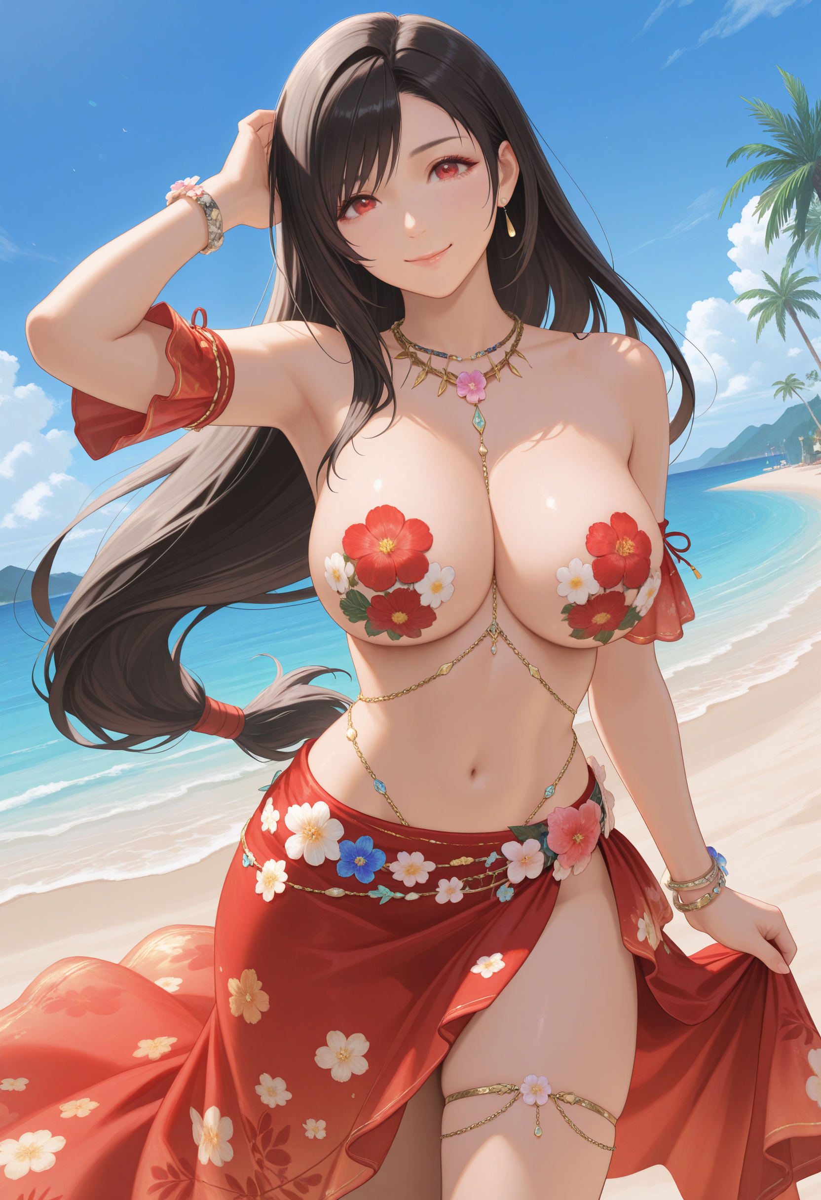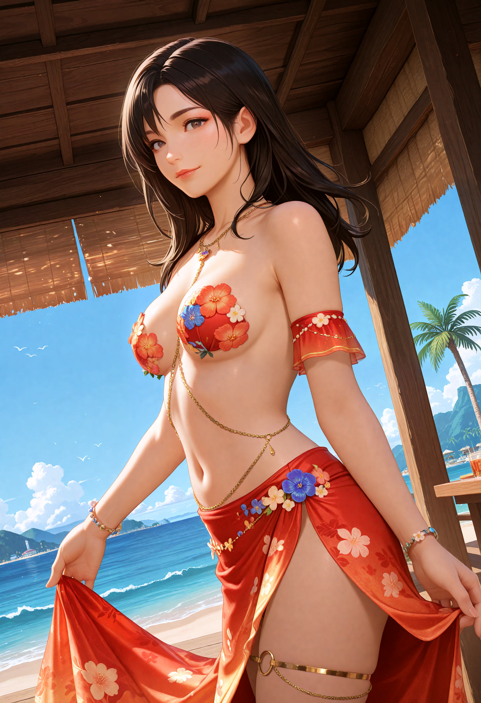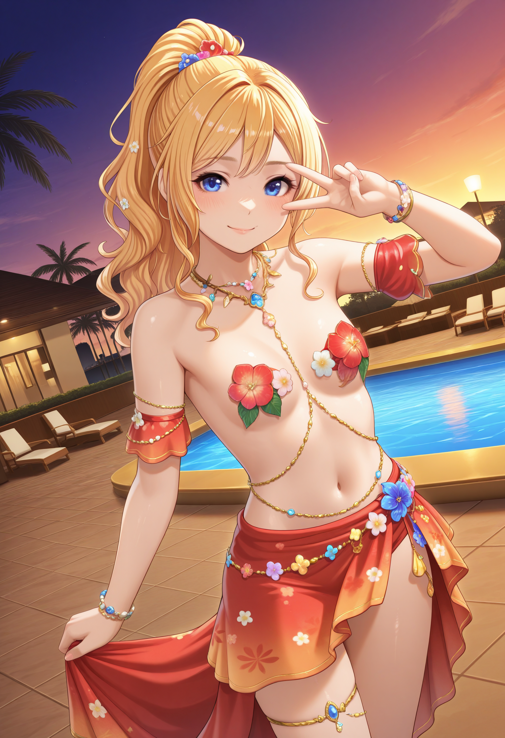 기본 프롬프트: "LalaVulpiaBule,flower bikini tops,strapless,necklace,detached sleeves,bracelet,body chains,floral print,flower,blue sarong,thigh chain,strappy heels"