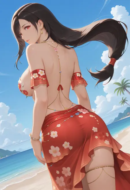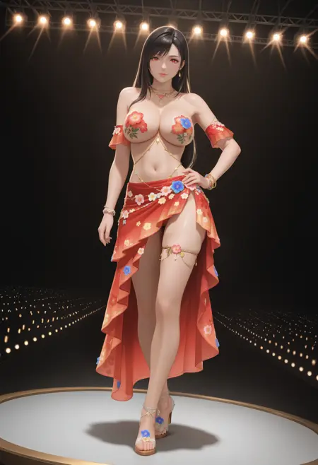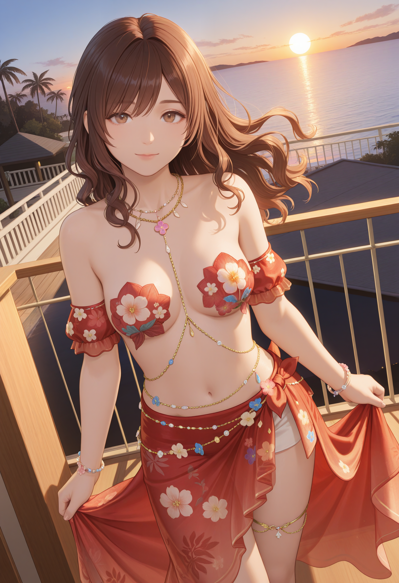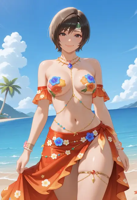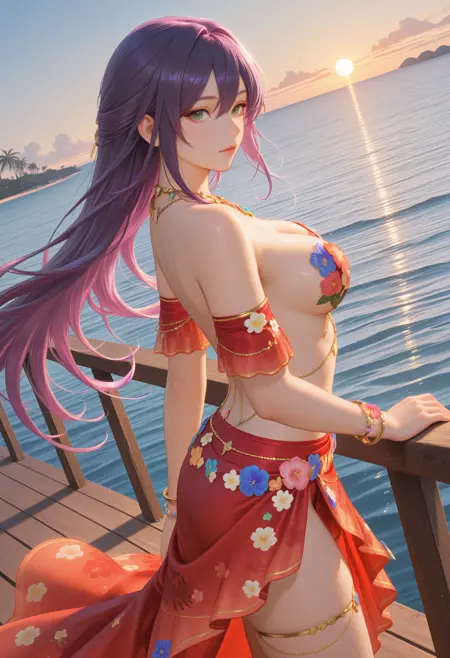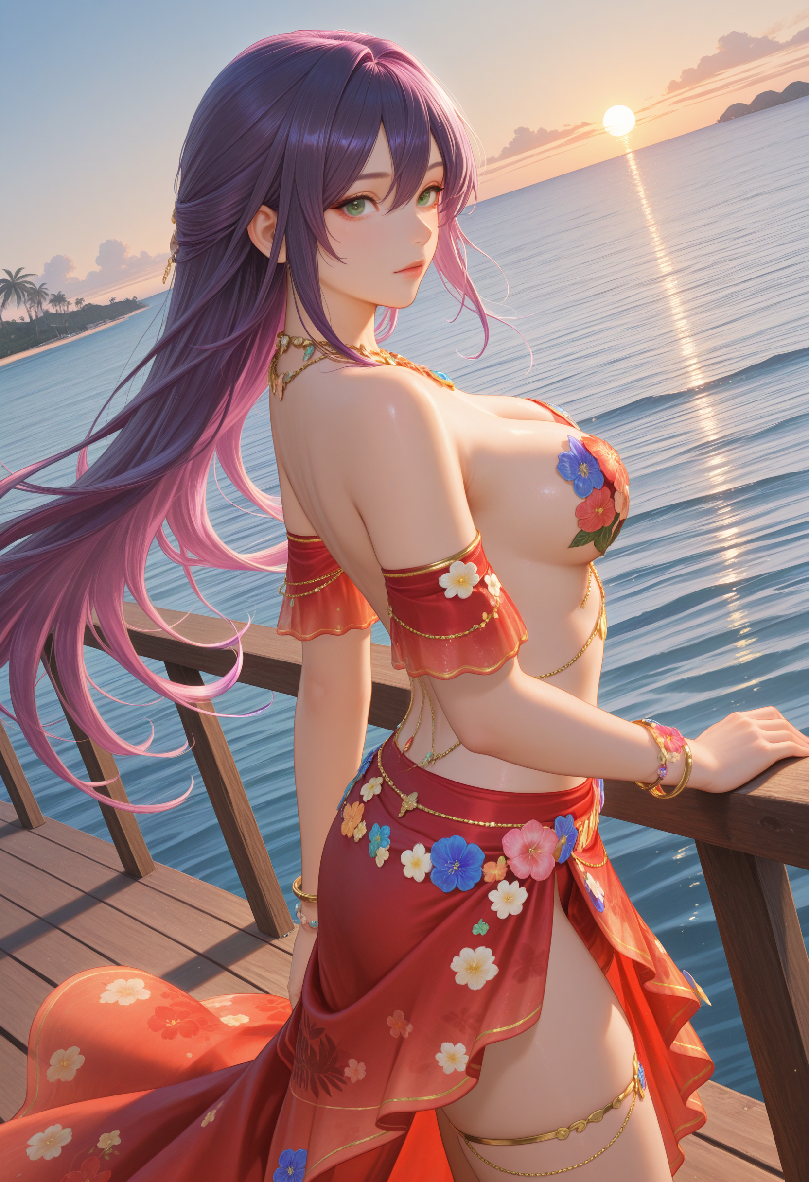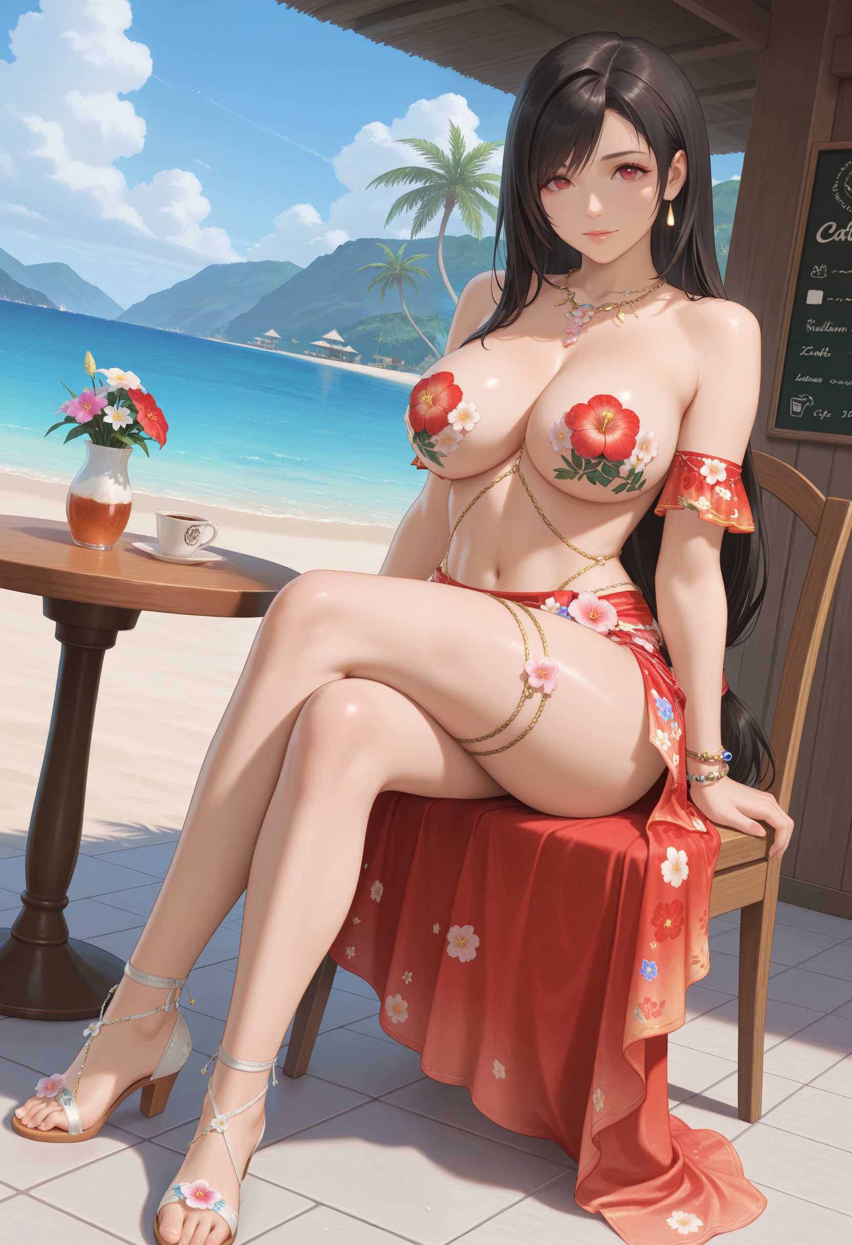 기본 프롬프트: "LalaVulpiaBule,flower bikini tops,strapless,necklace,detached sleeves,bracelet,body chains,floral print,flower,blue sarong,thigh chain,strappy heels"