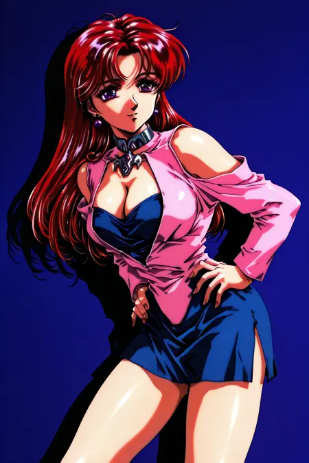 분홍색 재킷, 어깨 드러냄, 긴 소매, 가슴 노출, 낮은 네크라인, 파란색 상의, 파란색 치마, 미니 스커트, 측면 슬릿, 갈색 부츠, 브로치, 초커,