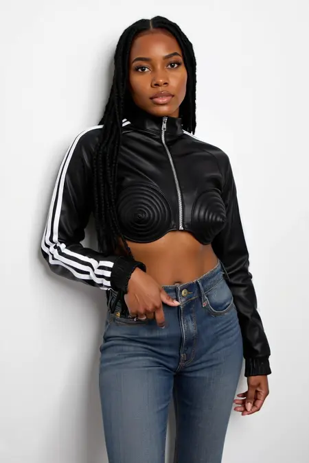黑色仿皮革短款拉链前襟夹克,带有雕塑感螺旋模塑胸垫、高领、长袖,袖子上饰有三条白色阿迪达斯风格条纹,亚光表面,贴身合体的躯干剪裁