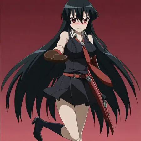 akame \(akame ga kill\), black hair, long hair, bangs, sidelocks, red eyes, collar, school uniform, skirt, necktie, gloves, socks, heels, large breasts, 1girl, solo