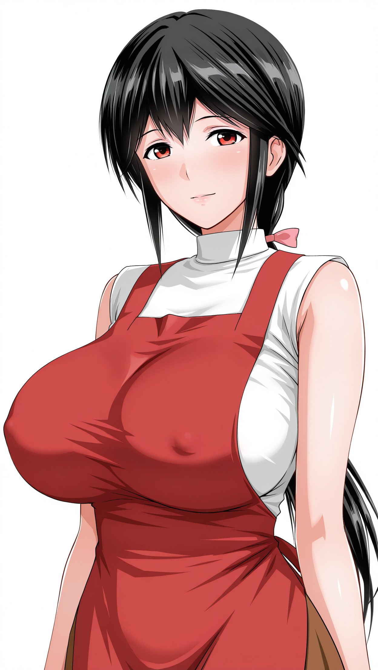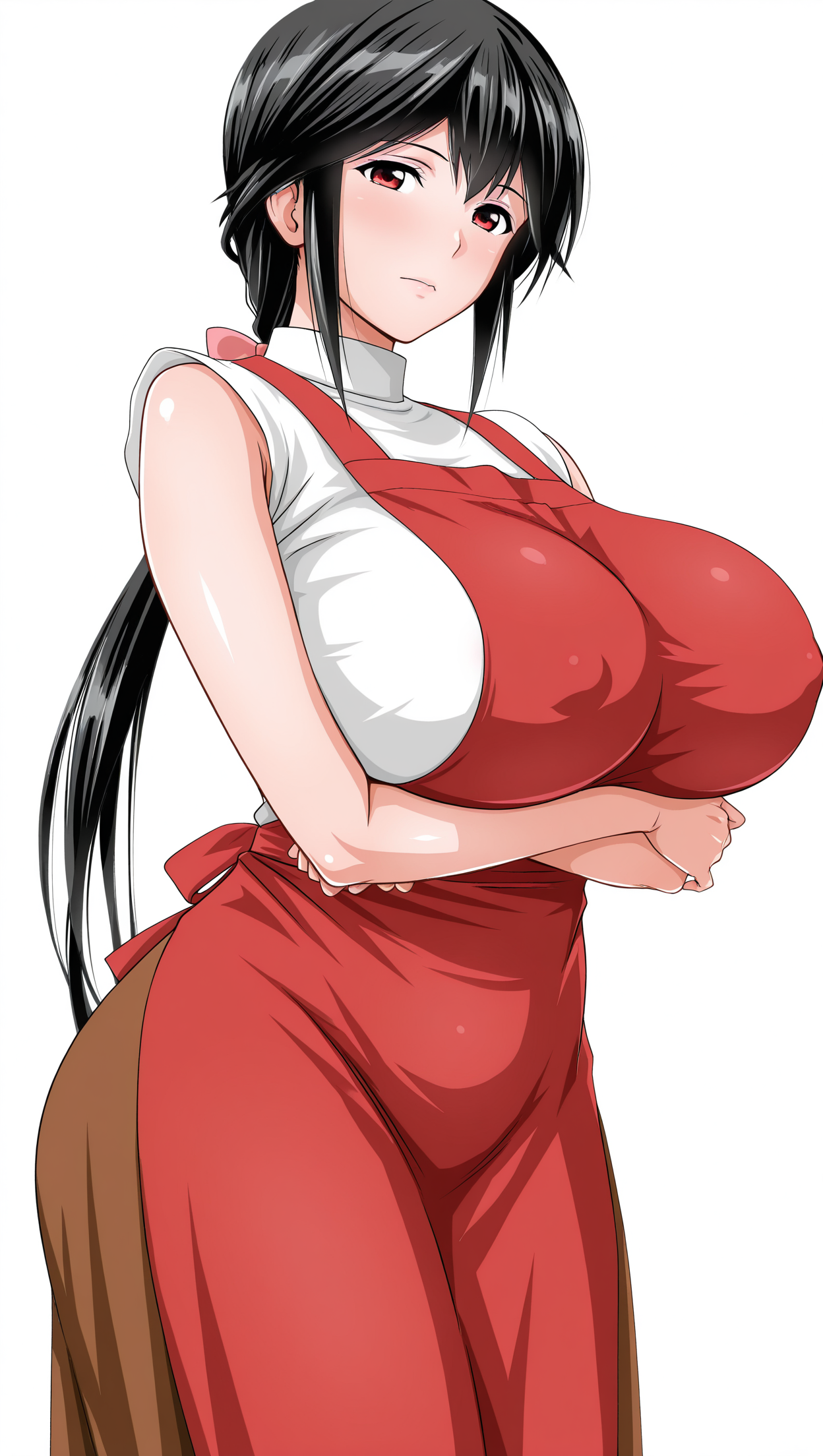 anime coloring, masterpiece, best quality, amazing quality, renboseikatsu, 1girl, solo, low-tied long hair, black hair, red eyes, big breasts, hair bow, shirt, white shirt, sleeveless, apron, red apron, skirt, brown skirt, solo, pose, standing, looking at viewer, from front, ((((white background, simple background))))