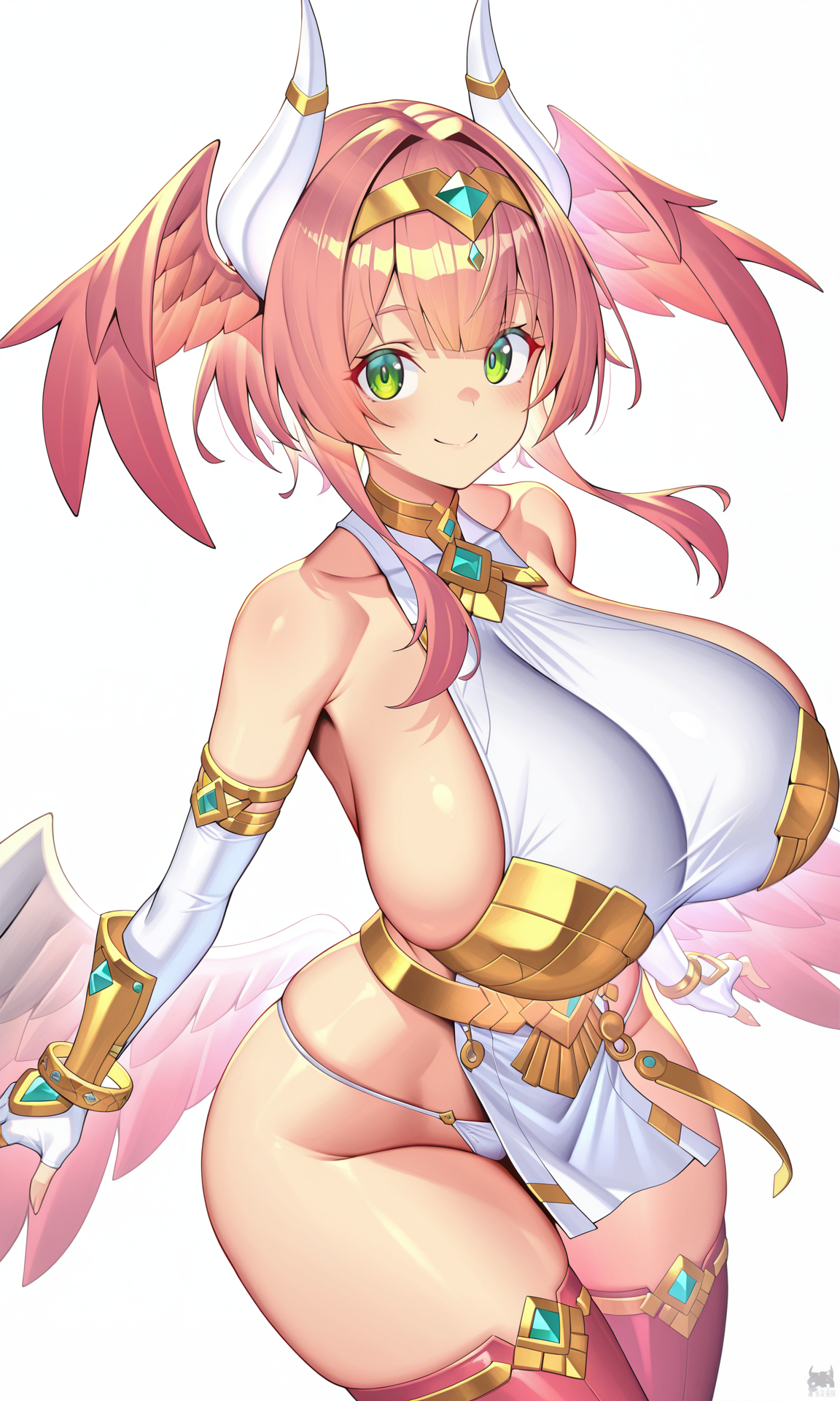 태그: 분홍색 머리카락, 머리 날개, 중앙 플랩 앞머리, 녹색 눈, 흰색 뿔, 단발, 측면 머리카락, 금색 머리띠, 보석,