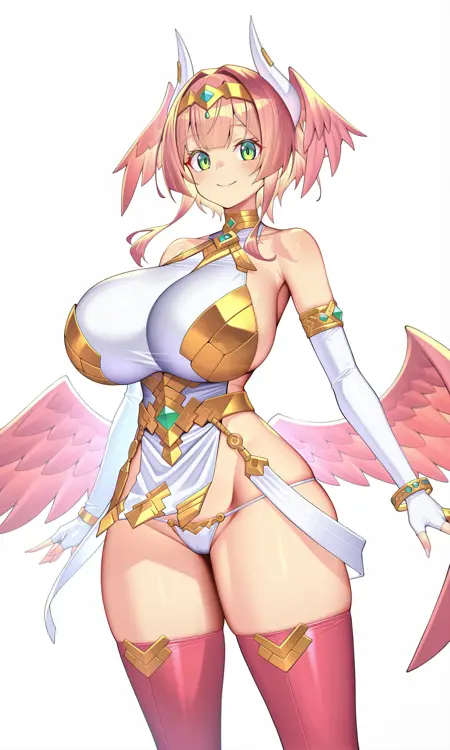 등이 드러난 옷, 흰색 테이버드, 소매 없음, 목 고리, 흰색 팬티, 스트링 팬티, 금색 팔찌, 분리된 소매, 흰색 소매, 금색 팔찌, 단일 팔찌, 단일 판어, 손가락 없는 장갑, 흰색 장갑, 드러난 어깨, 금색 가슴갑옷, 금색 벨트,