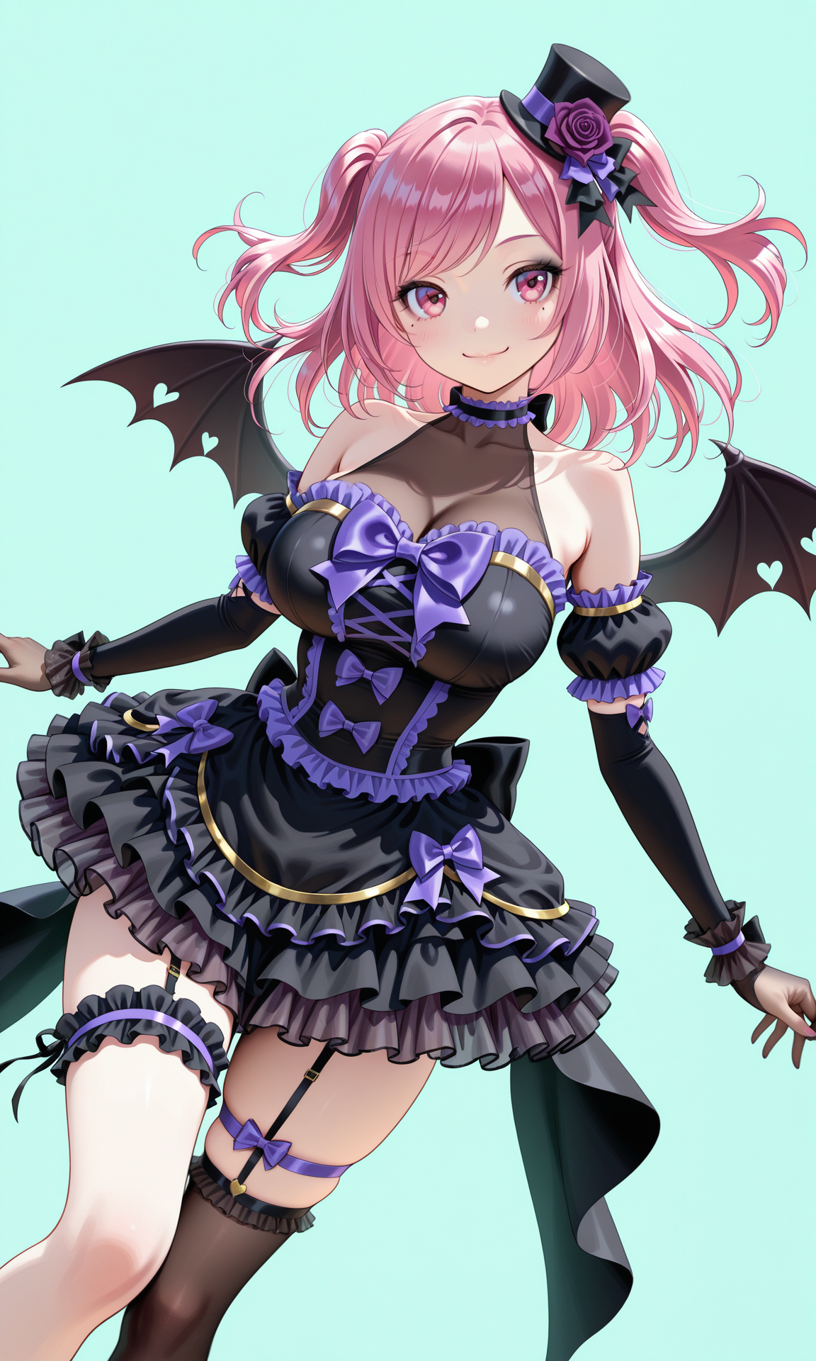 태그: 모자, 꽃, hat_flower, 미니 모자, 탑햇, 보라색 꽃, 장미, 보라색 장미, 양쪽 위로, 분홍색 머리, 긴 머리, 스윕 앞머리, 분홍색 눈, 눈 밑 점, tsurime, 검은 아이섀도우,