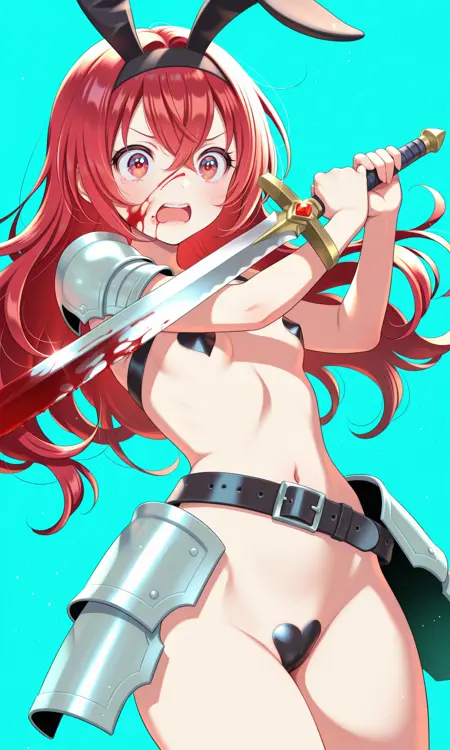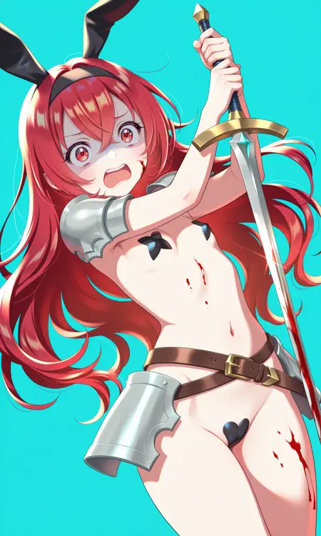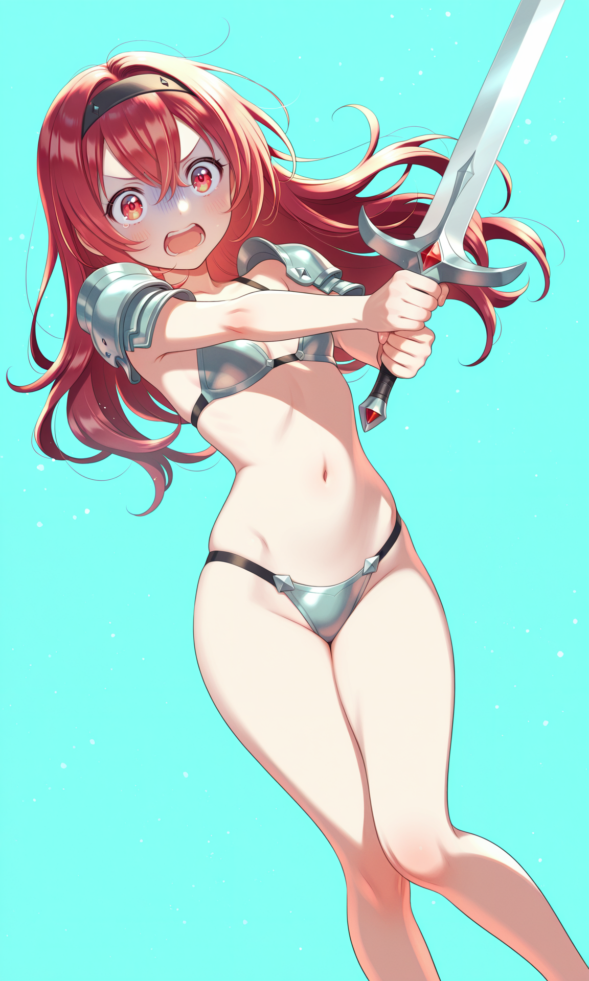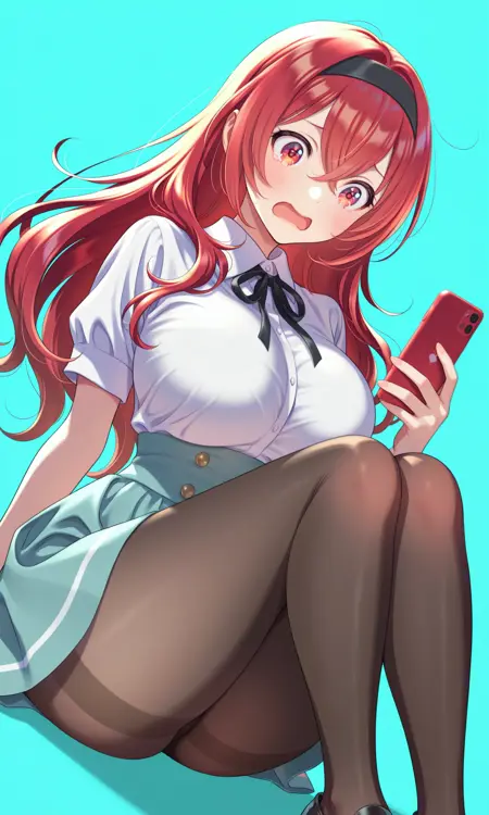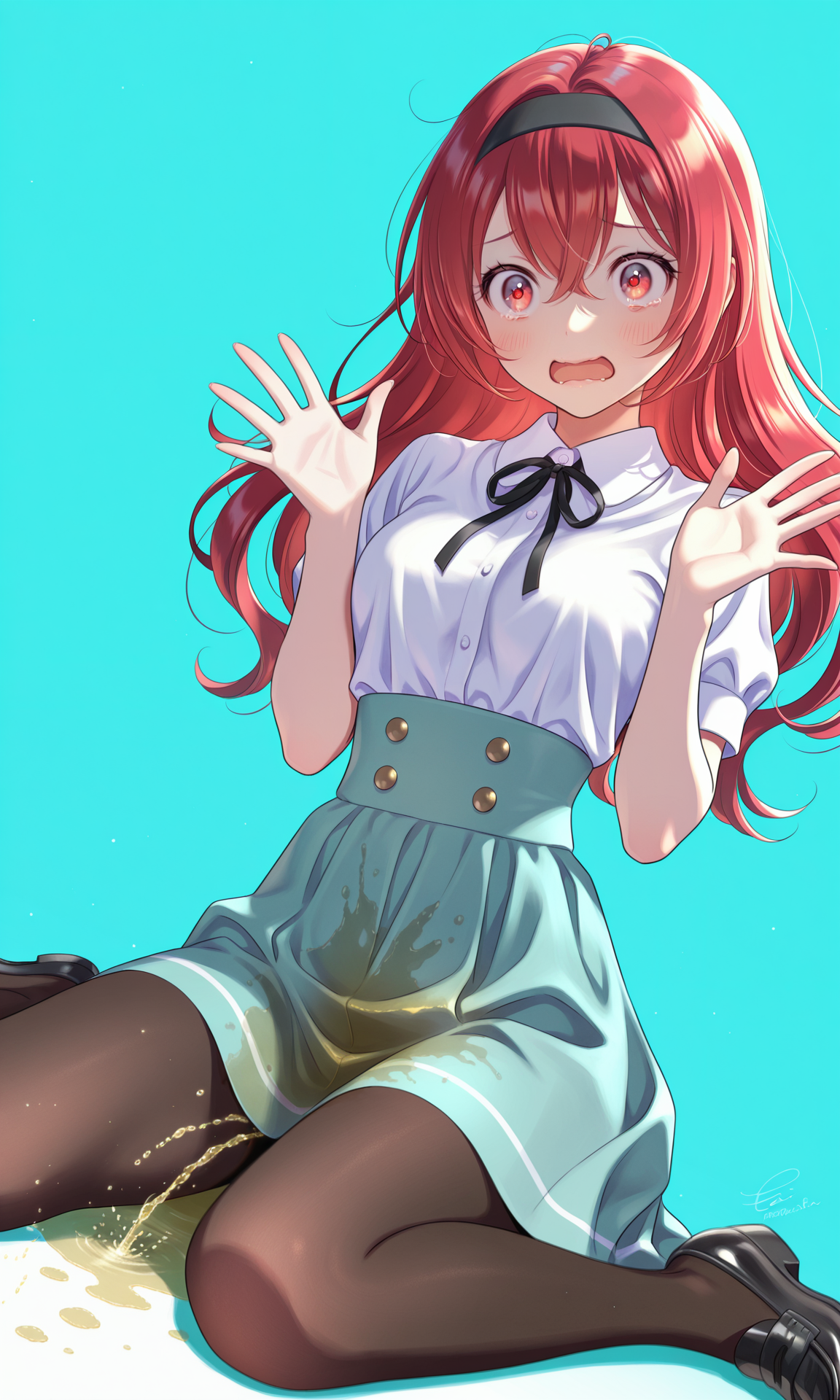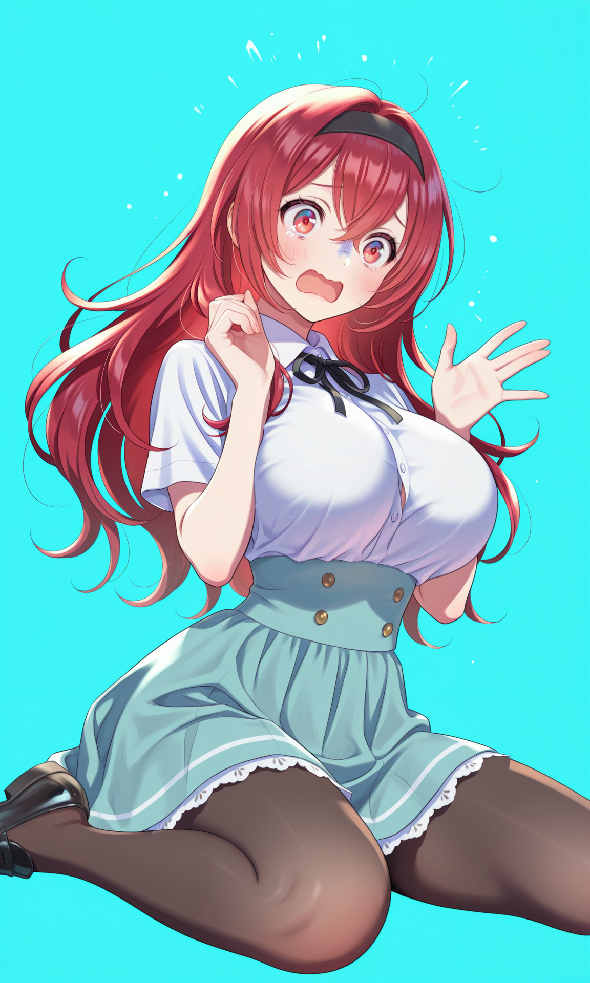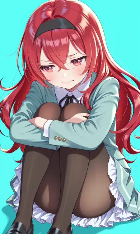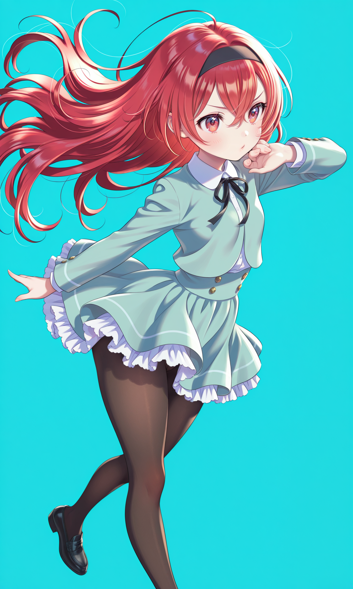 キャラクター:赤髪、長い髪、黒いヘアバンド、額に髪が垂れている、赤い目、