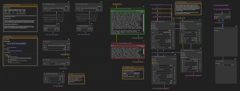 WAN Video 2.2 のハイノイズおよびローノイズモデル(14B fp8)を用いた、静止画像生成のための簡素化されたテキストから画像へのワークフローです。この設定では、追加の条件付け(LoRA および CNet)を排除し、ベースモデルの能力に焦点を当てています。