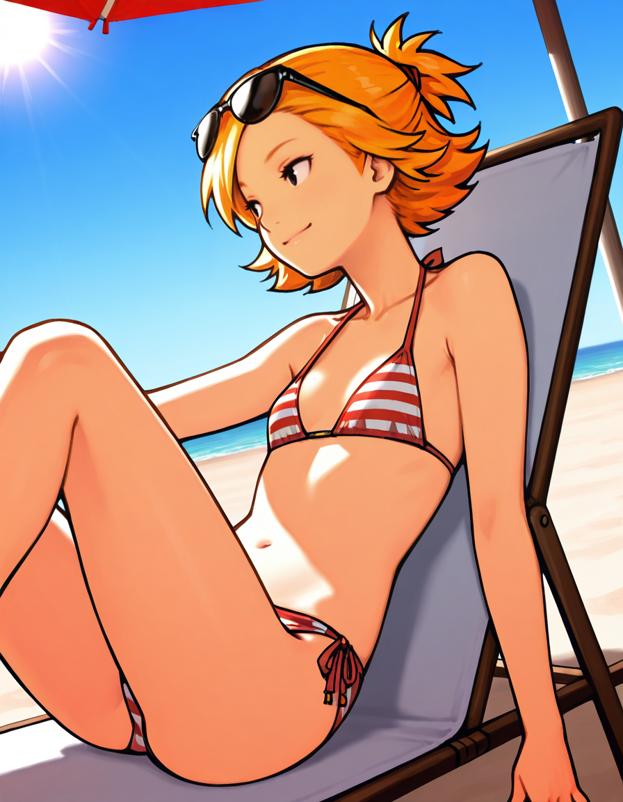 彼女が帽子を脱ぐと、髪が少し後ろでポニーテールに束ねられているので、そのようにプロンプトしてみました…