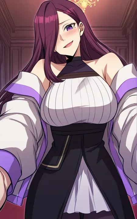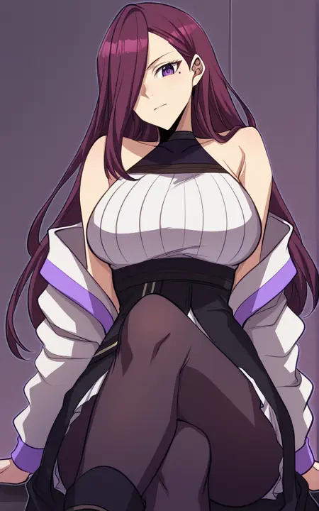 Kawasaki,1个女孩,单独,紫色眼睛,深紫色头发,长发,侧梳刘海,头发遮住一只眼睛,长鬓角,散乱头发,眼下有痣,