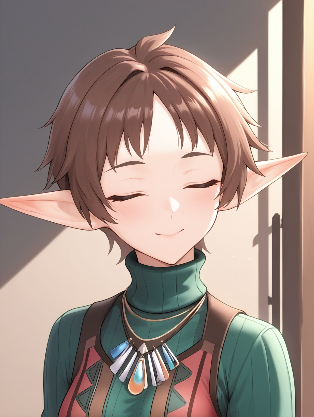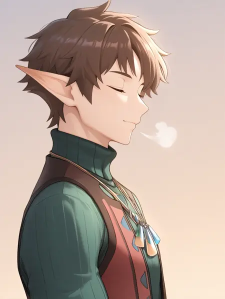 プロンプトの例: burusufia,茶色の髪,目を閉じている,尖った耳,緑のタートルネックセーター,開いたベスト,短い袖,パンツ,ガード,緑のポーチ,靴,