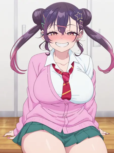 提示词:1girl,发髻,红色领带,双发髻胸部显露,乳房,发饰,星(符号),棕色眼睛,双马尾,校服,发夹,脸红,白衬衫,耳后头发,珠宝,耳环,辣妹,毛衣百褶裙,毛衣_down