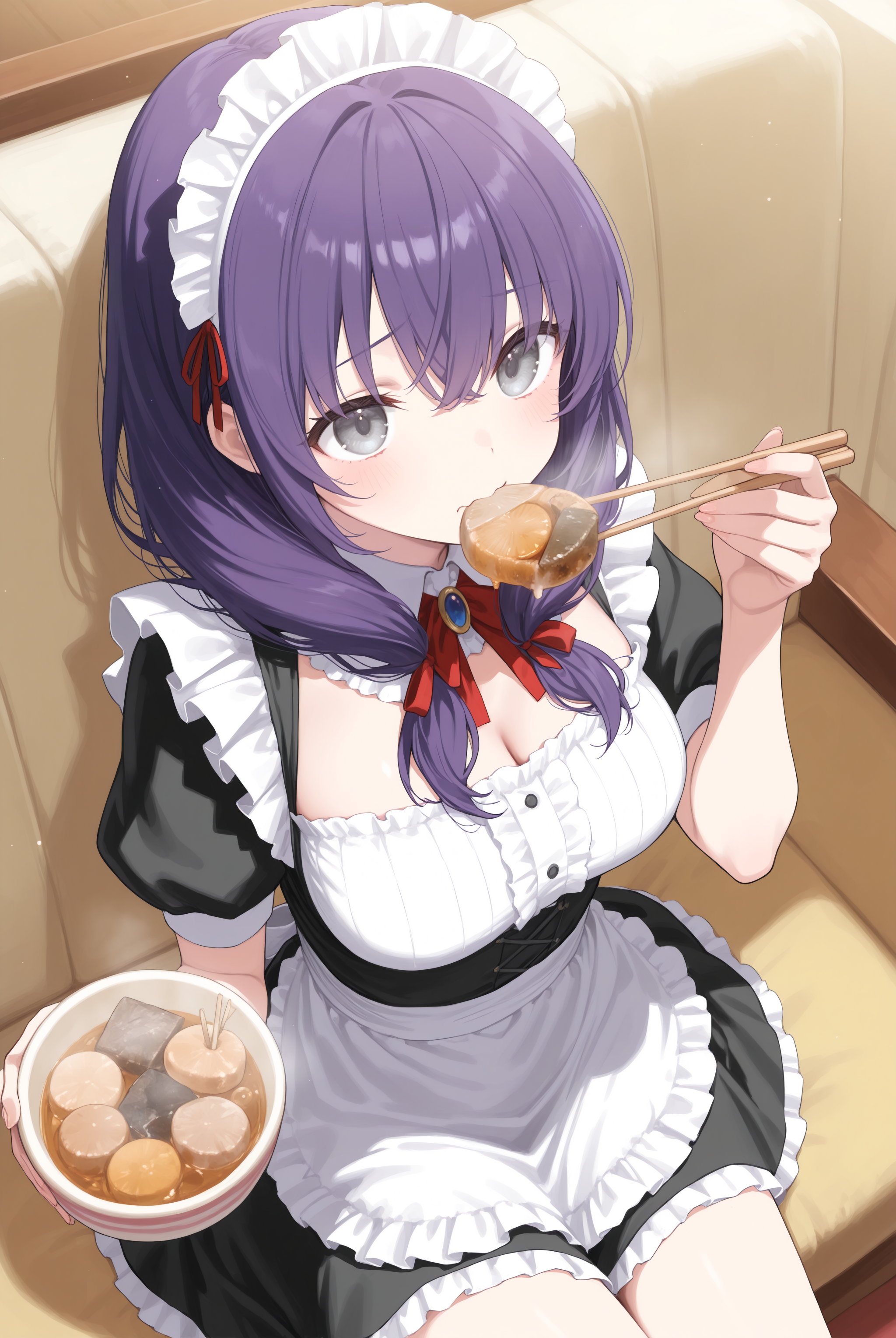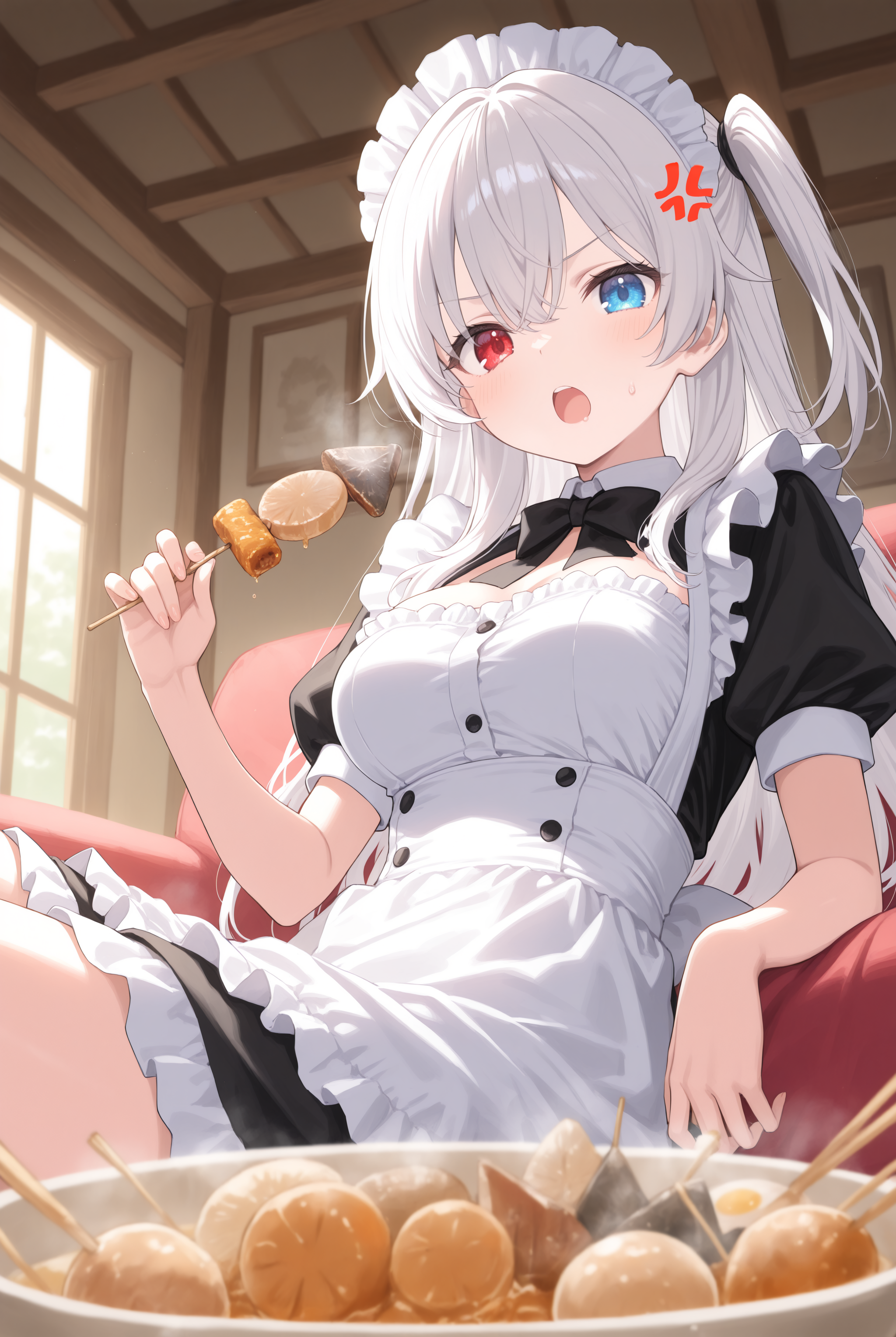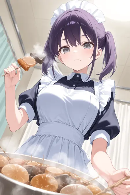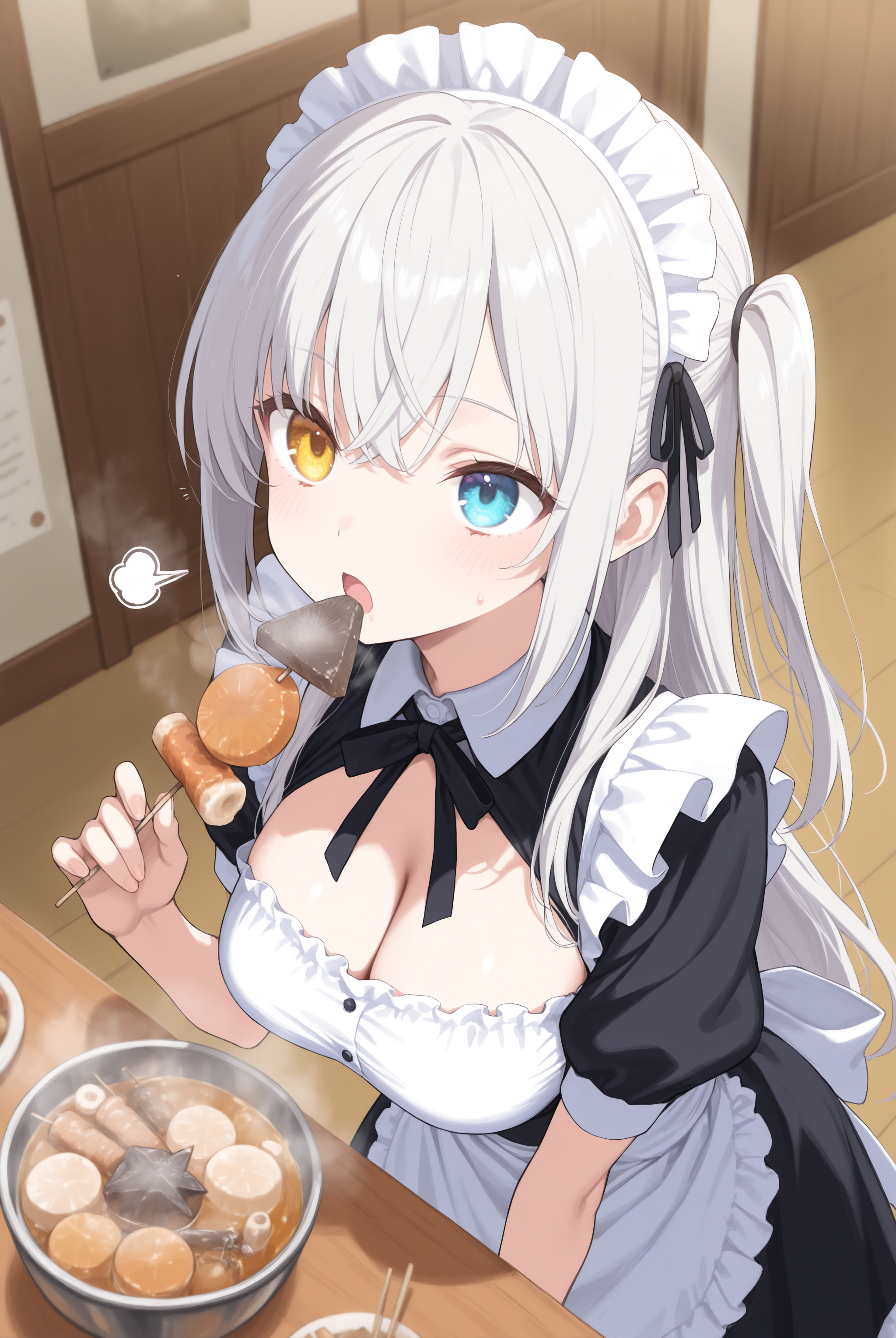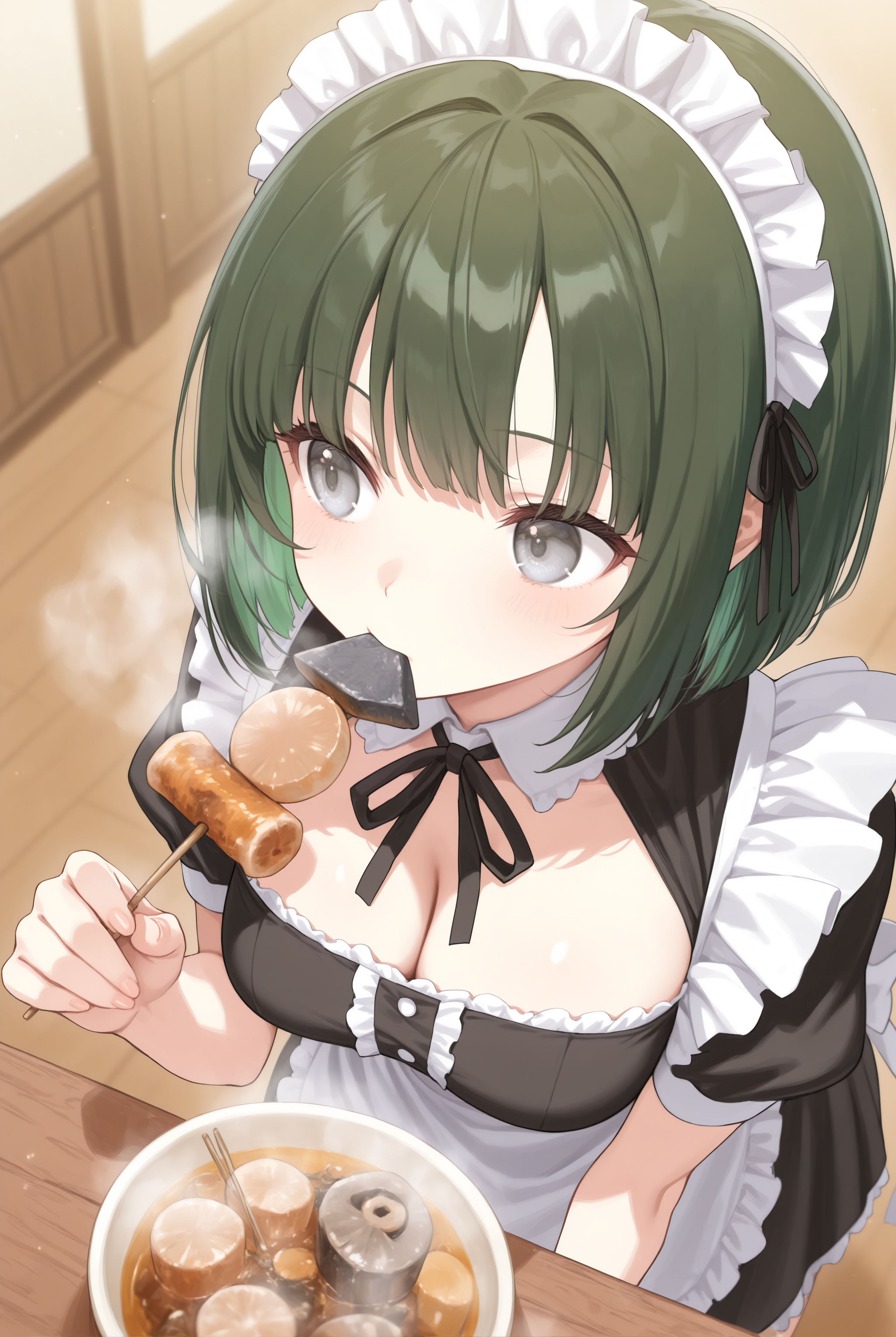 トリガーだけでも出ますが通常はチビ太のおでんと言われるような3種類の具材を串に刺した状態が出やすいです。food, eating, holding food, steam 辺りはお好みで、skewer で串での食事、holding chopsticks, holding bowl で箸での食事、oven mitts, cooking pot, cooking で調理中が出ます。