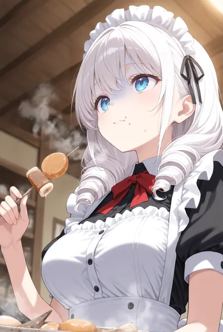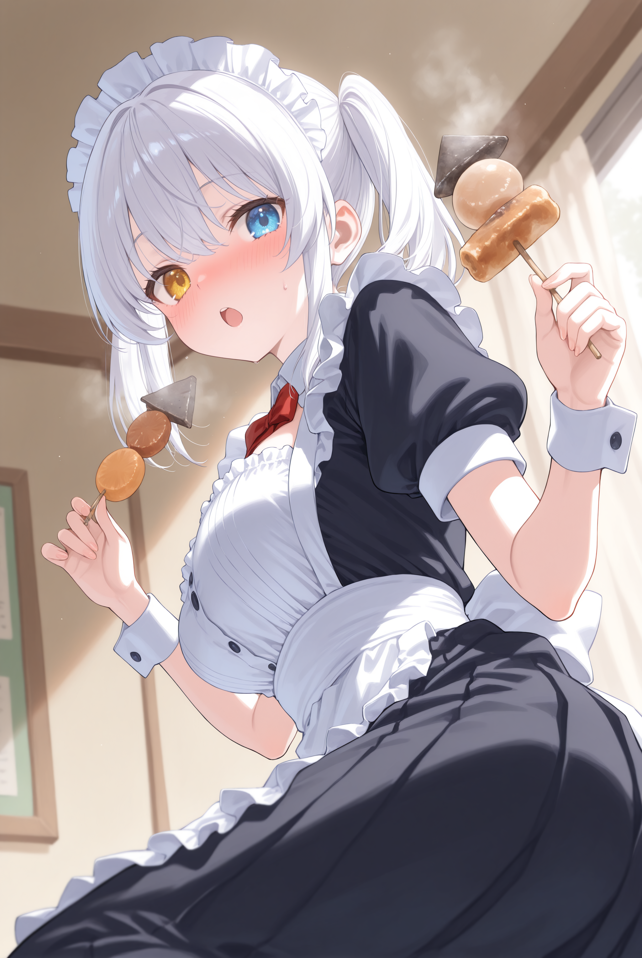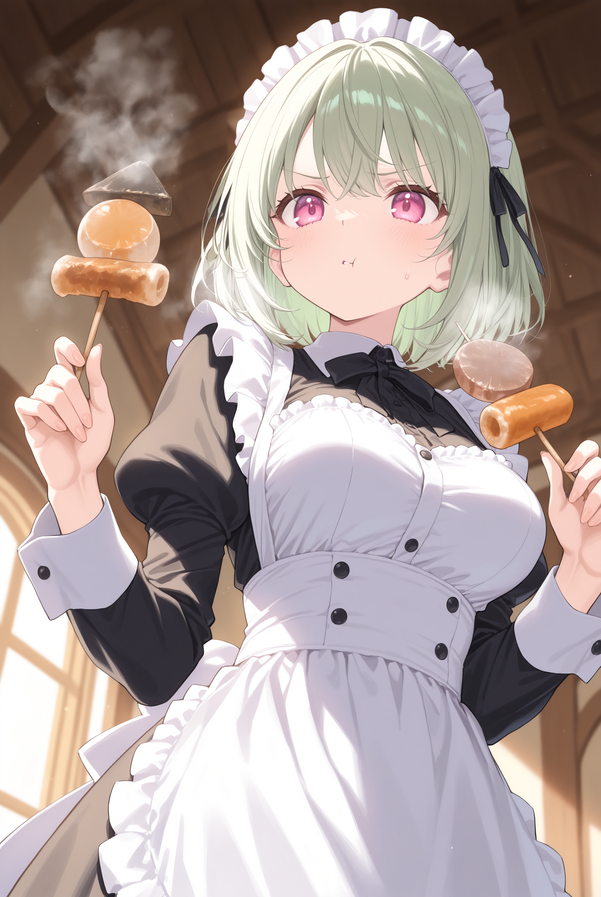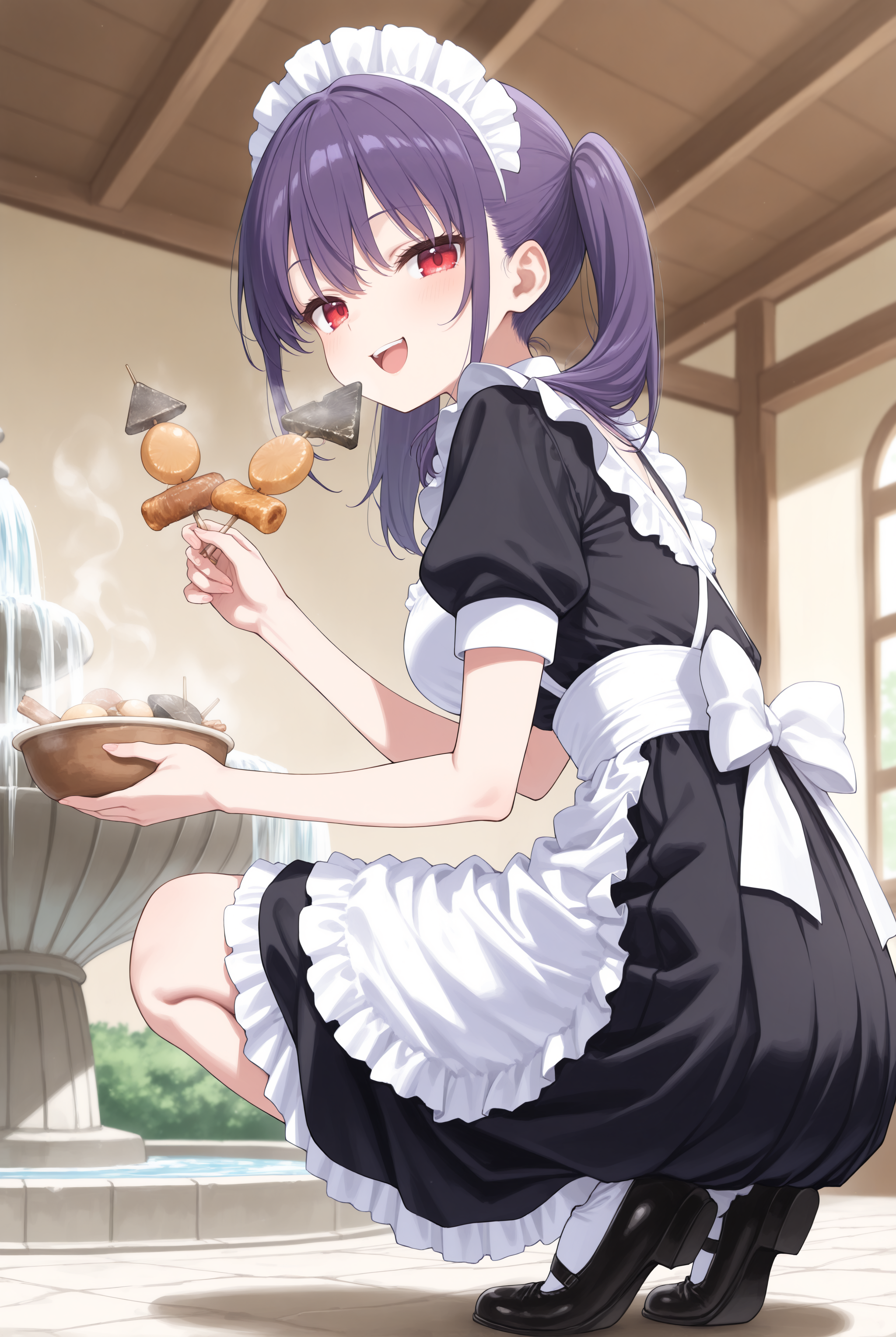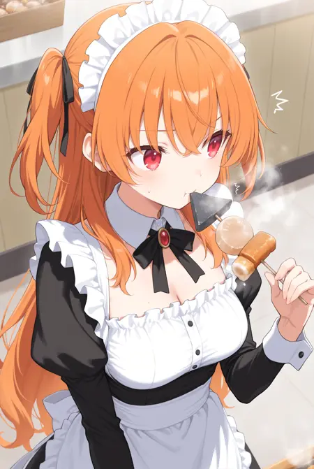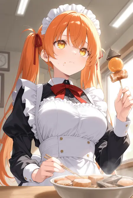 トリガーだけでも出ますが通常はチビ太のおでんと言われるような3種類の具材を串に刺した状態が出やすいです。food, eating, holding food, steam 辺りはお好みで、skewer で串での食事、holding chopsticks, holding bowl で箸での食事、oven mitts, cooking pot, cooking で調理中が出ます。