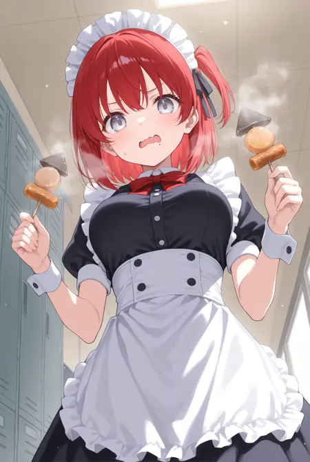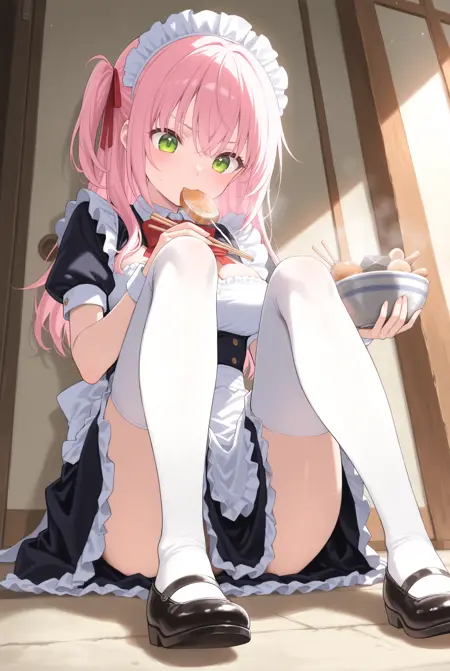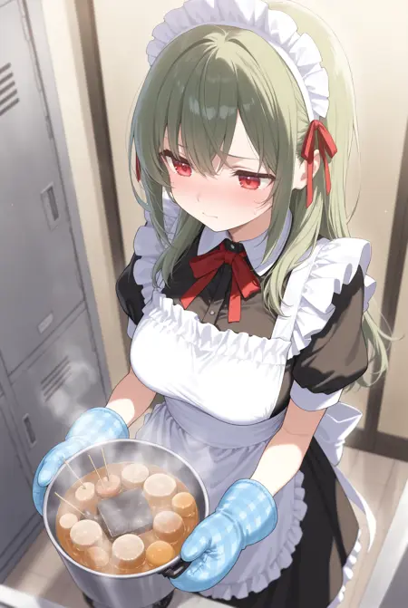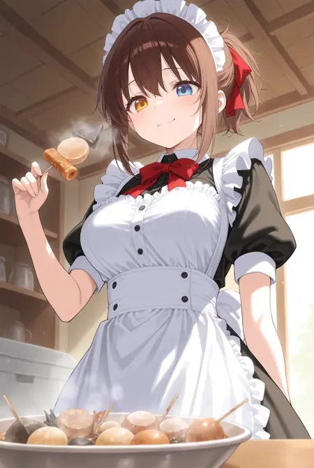 While the trigger alone may produce results, it typically yields the classic oden skewer with three ingredients, often called Chibita's oden. Food, eating, holding food, steam are optional. Skewer indicates eating with skewers; holding chopsticks, holding bowl indicates eating with chopsticks; oven mitts, cooking pot, cooking indicate cooking in progress.