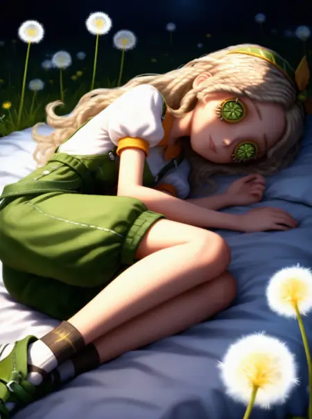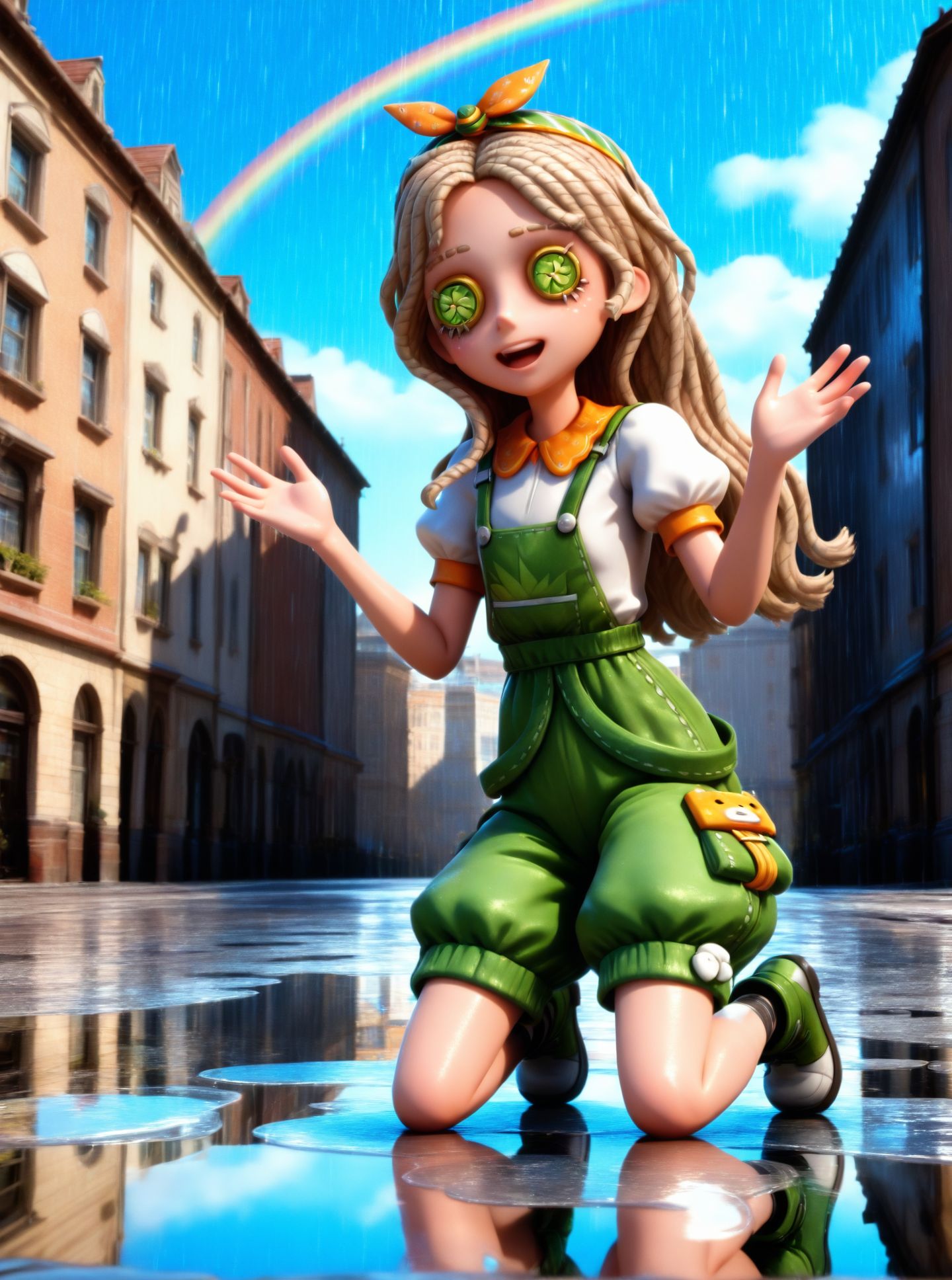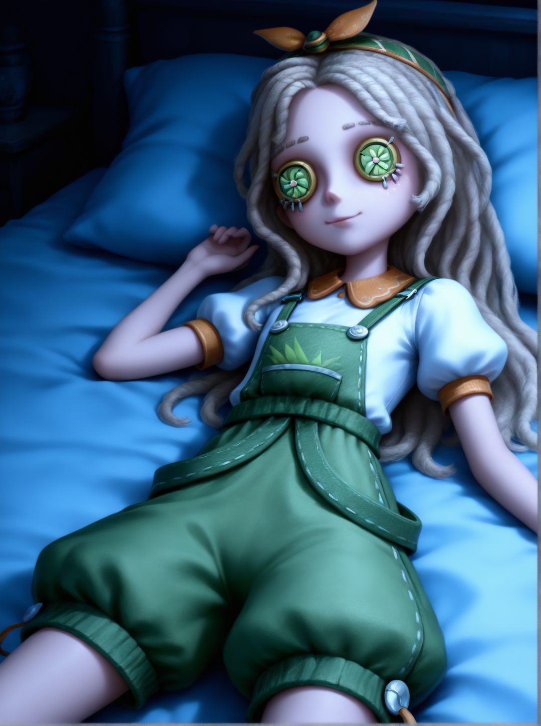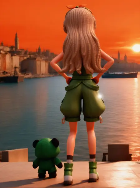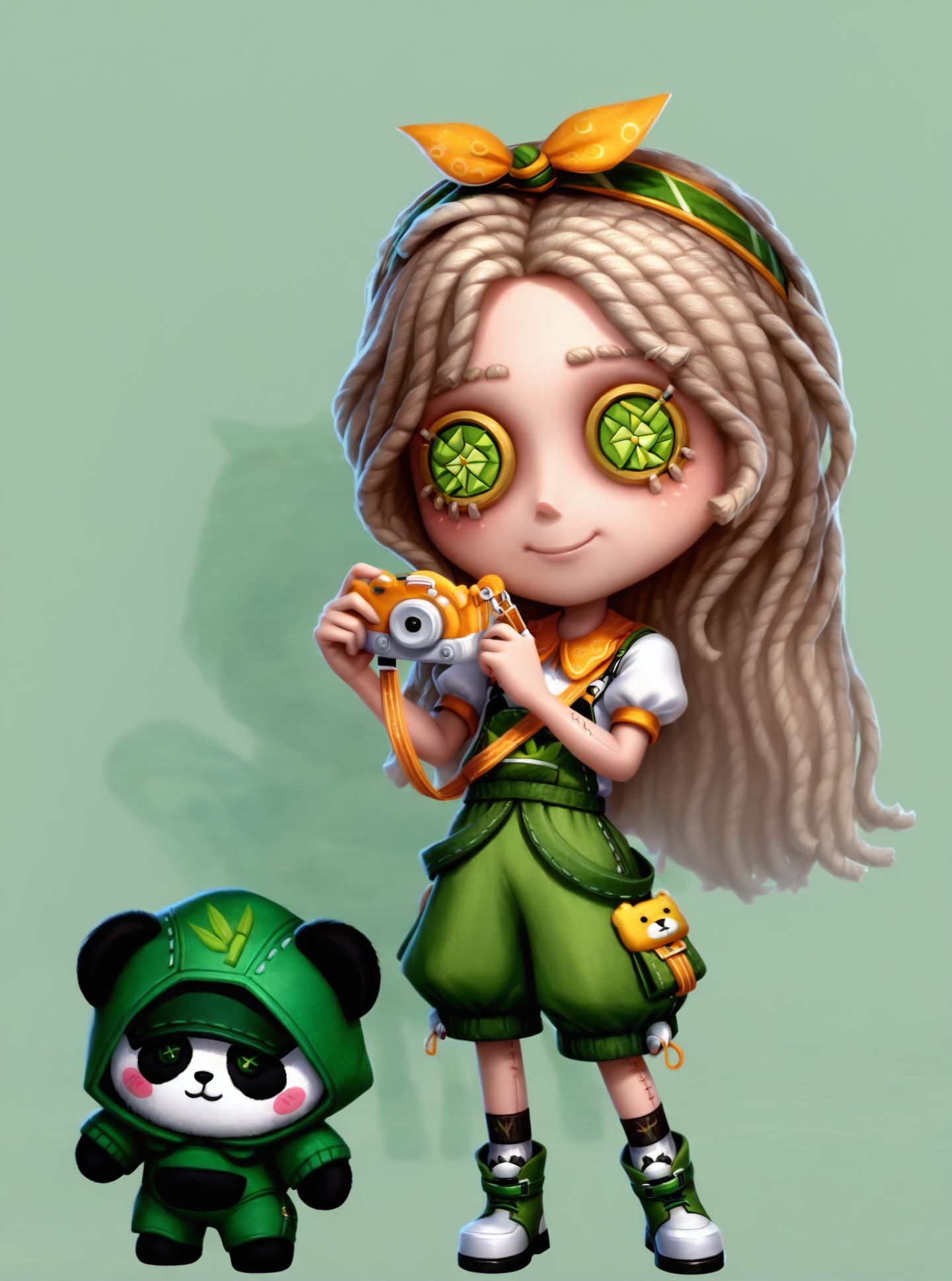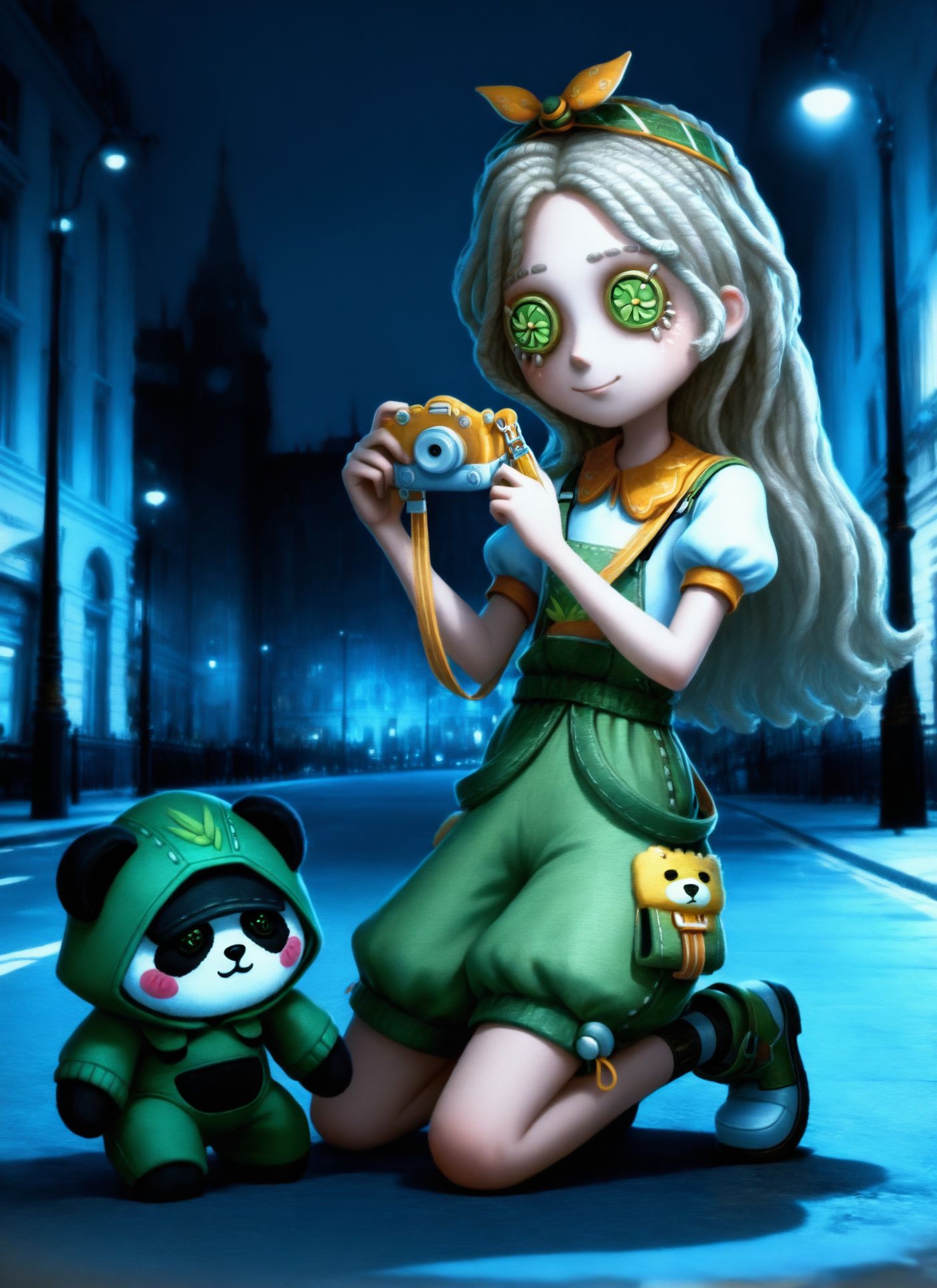 트리거 단어: XVH, solo, 카메라, 1girl, 헤어밴드, 연한 황금갈색 머리, 긴 머리, 녹색 눈, 단추 눈, 흰 셔츠, 풍성한 짧은 소매, 녹색 오버숏, 노란 주머니, 줄무늬 양말, 부츠, 뽀로로 곰 인형을 들고 있음, yuan style