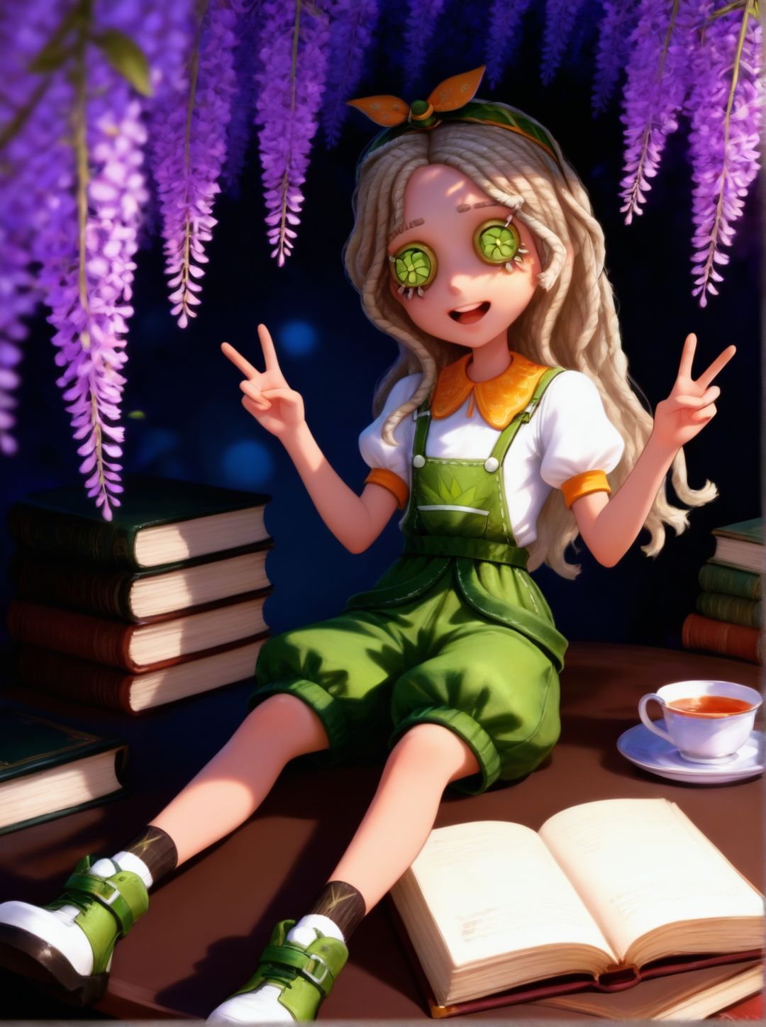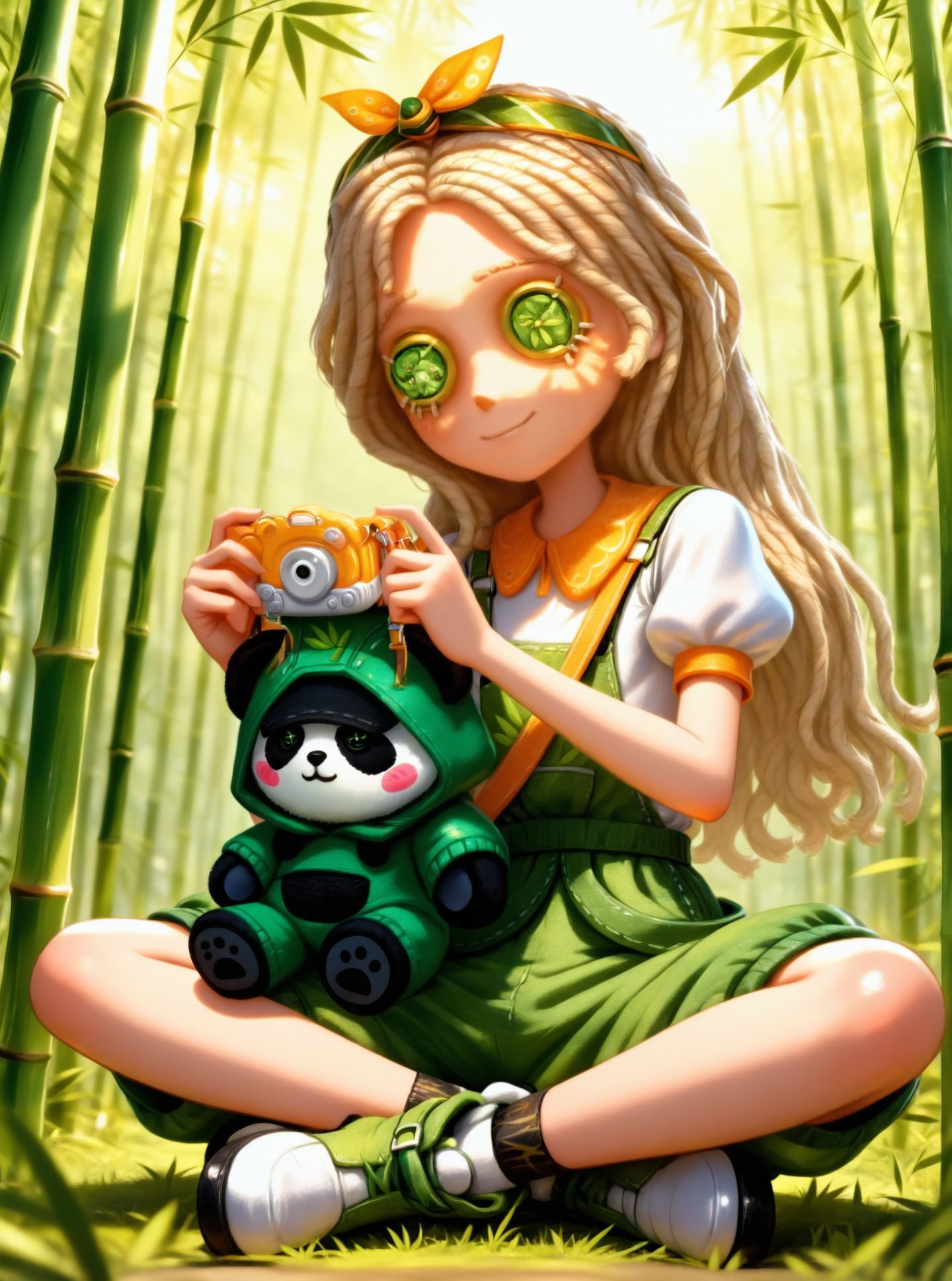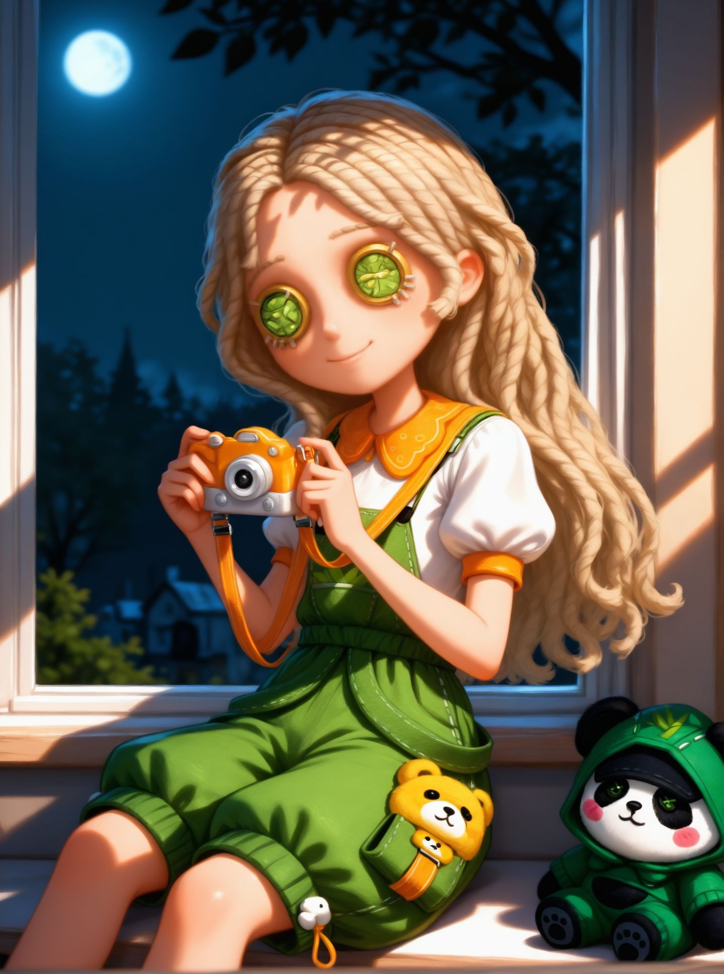트리거 단어: XVH, solo, 카메라 스트랩, 카메라, 1girl, 헤어밴드, 연한 황금갈색 머리, 긴 머리, 녹색 눈, 단추 눈, 흰 셔츠, 풍성한 짧은 소매, 녹색 오버숏, 노란 주머니, 줄무늬 양말, 부츠, 뽀로로 곰 인형을 들고 있음