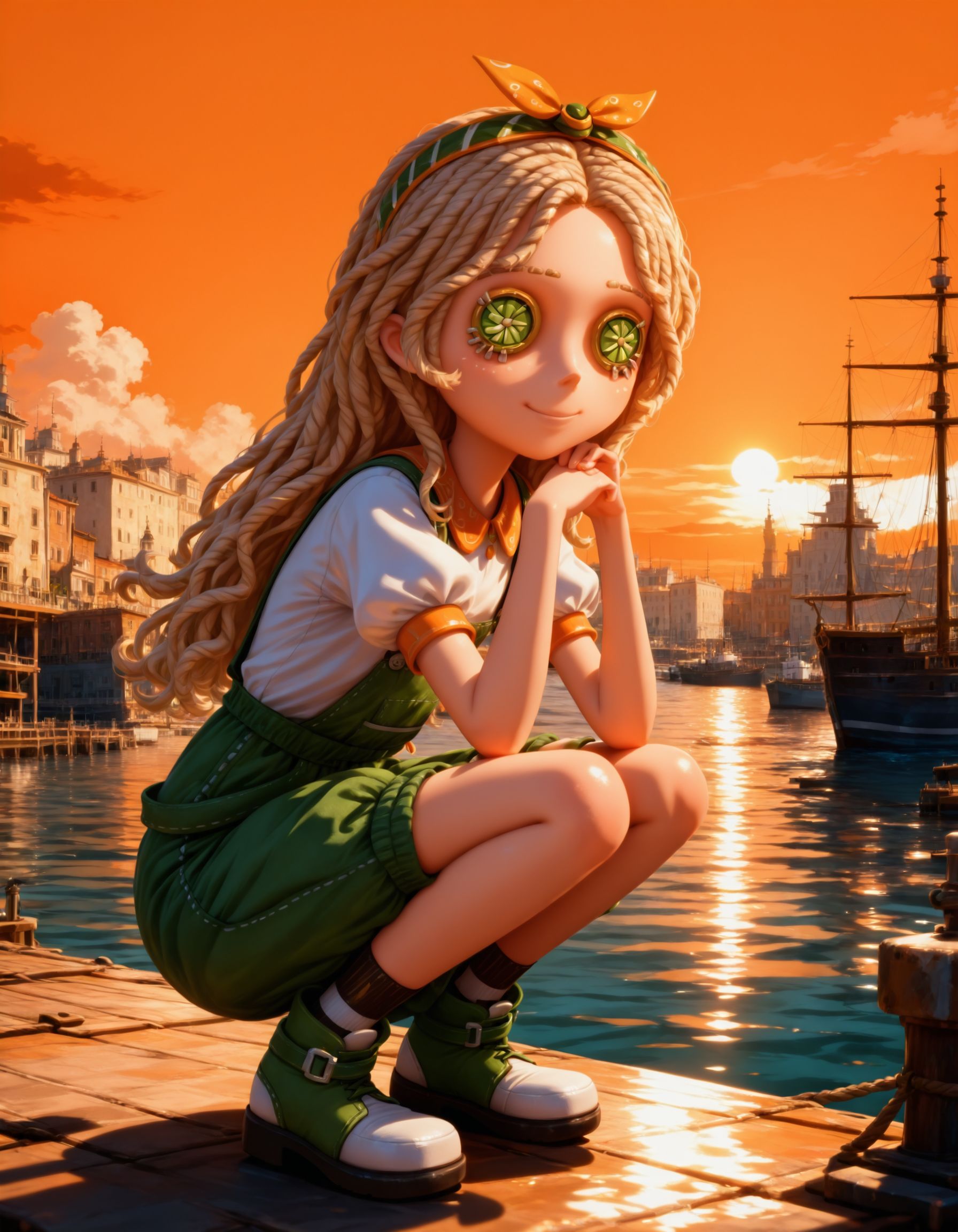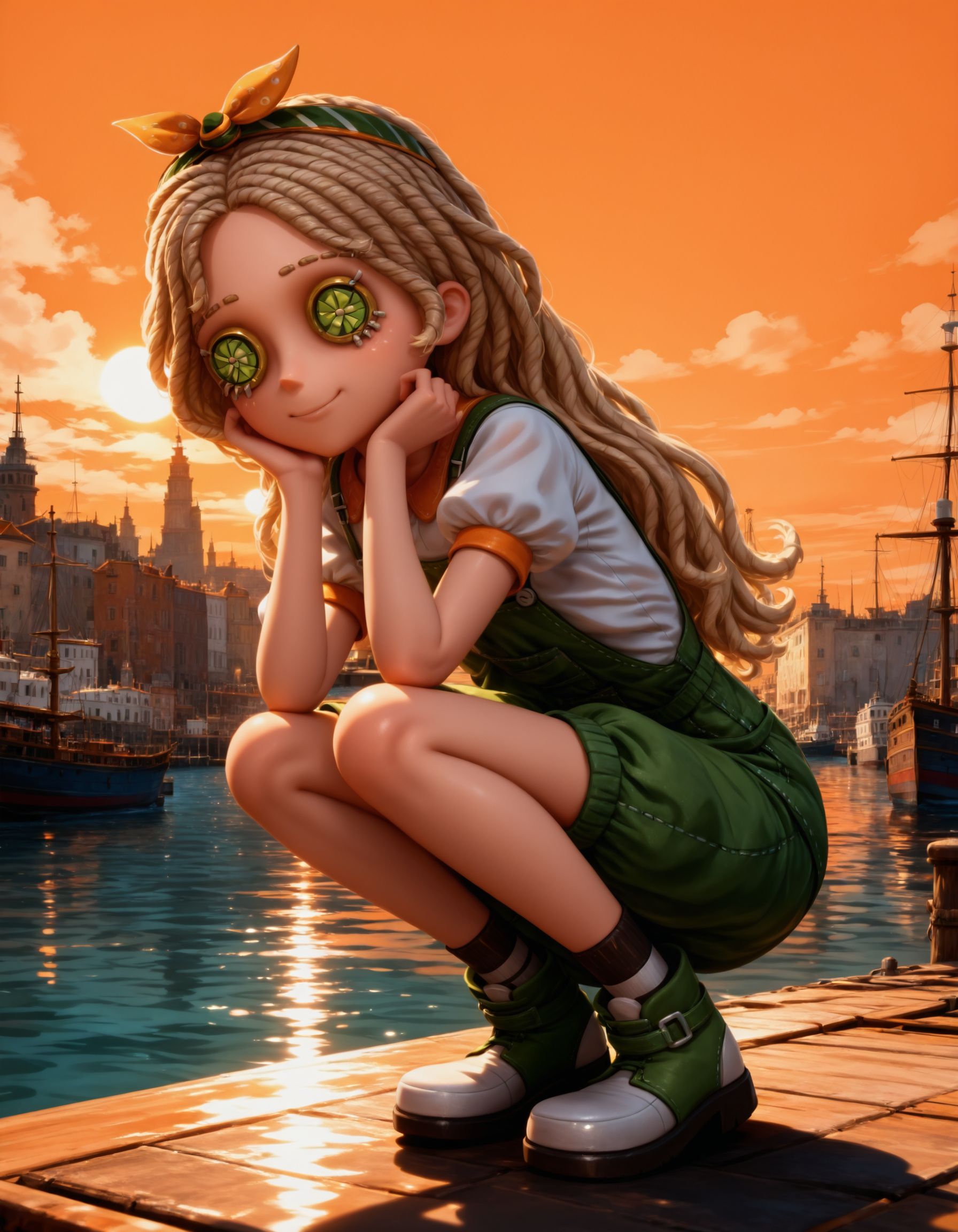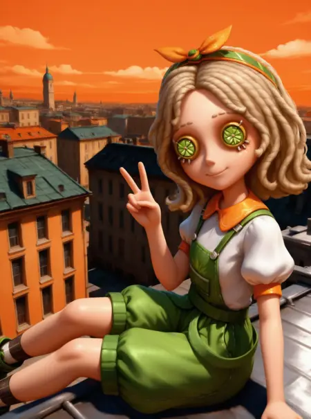 트리거 단어: XVH, solo, 카메라 스트랩, 카메라, 1girl, 헤어밴드, 연한 황금갈색 머리, 긴 머리, 녹색 눈, 단추 눈, 흰 셔츠, 풍성한 짧은 소매, 녹색 오버숏, 노란 주머니, 줄무늬 양말, 부츠, 뽀로로 곰 인형을 들고 있음