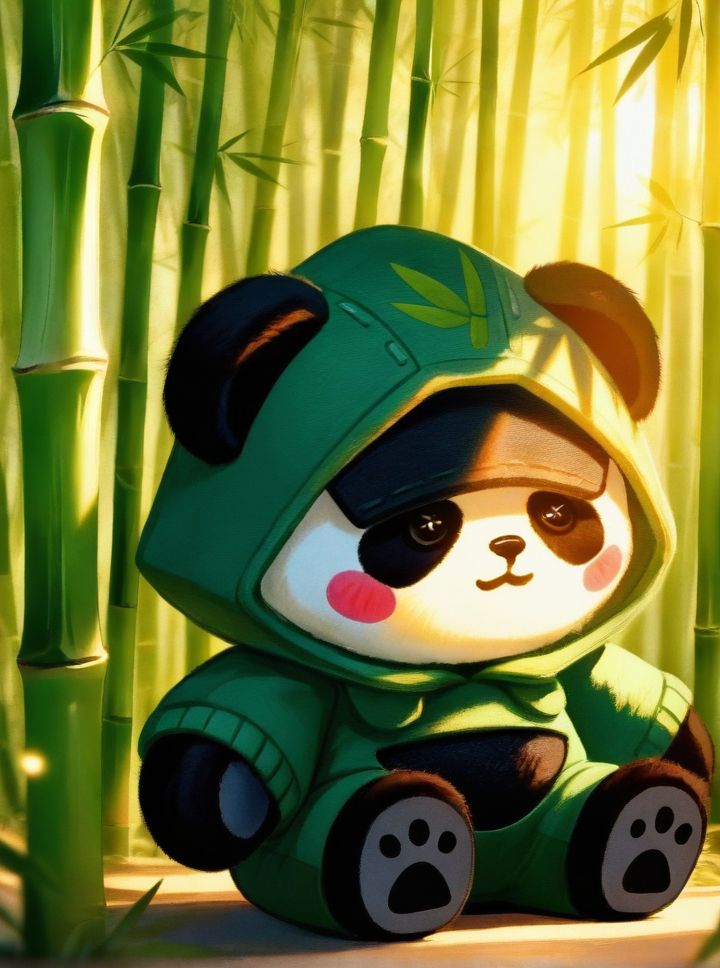 단독 뽀로로 곰 인형 트리거 단어: stuffed panda, bamboo forest, solo, 앉아 있음, 대나무 싹, 인물 없음, 무드라이팅
