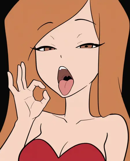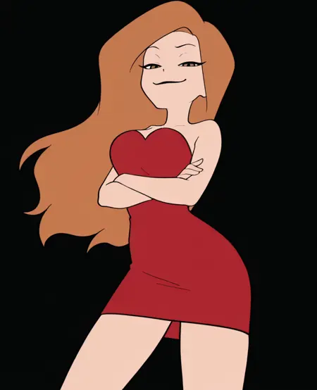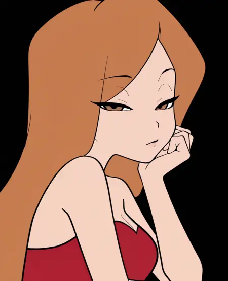 suc1, 1girl, long hair, orange hair, brown eyes, red dress, strapless, half-closed eyes, high heels,
