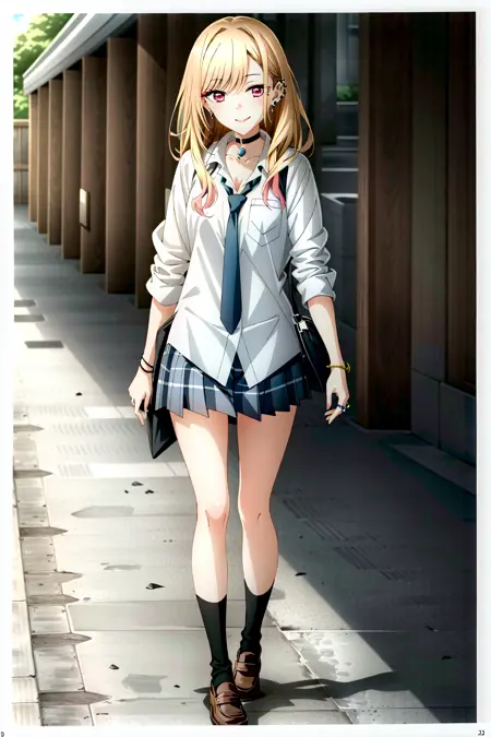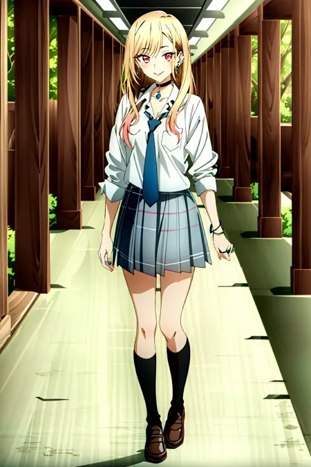 Marin Kitagawa, blonde hair, jewelry, solo, skirt, school uniform, choker, necktie, red eyes, ring, long hair, shirt, full body, smile, v, socks, black choker, bracelet, earrings, white shirt, piercing, brown footwear, black socks, looking at viewer, shoes, plaid skirt, pleated skirt, multicolored hair, tied shirt, loafers, ear piercing, grin, plaid, bangs, standing, blue skirt, colored tips