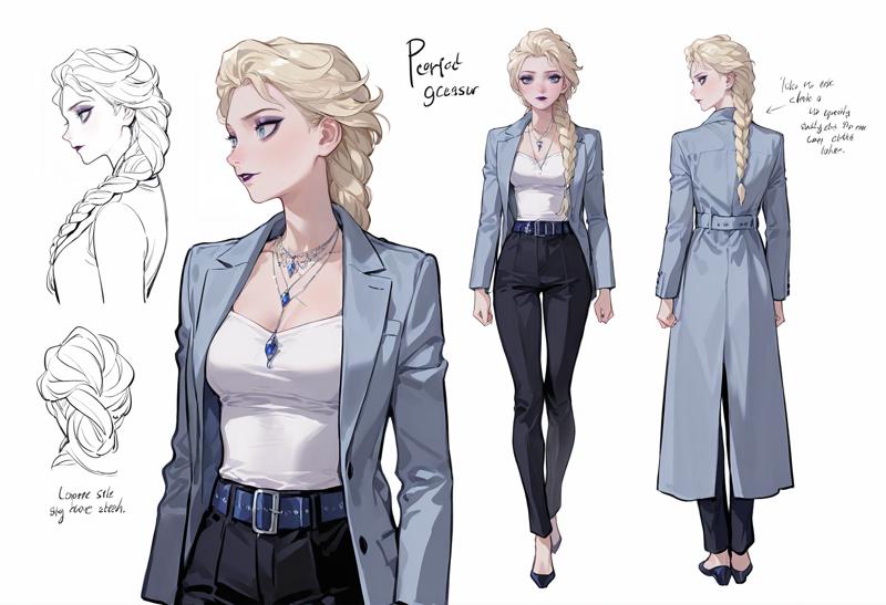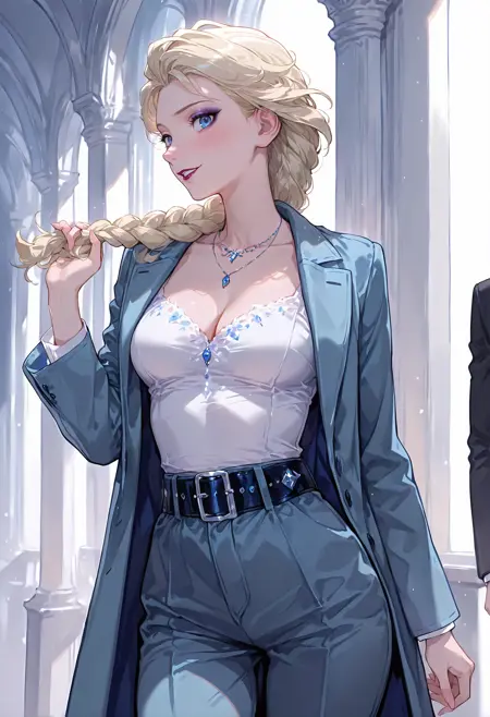 빗어올린 토끼 꼬리, 어깨에 걸친 머리, 보석, 목걸이, 가슴, 벨트, 바지, 재킷, 코트, 긴 소매, 정장 스타일, 열린 옷, 중간 크기 가슴, 대체 복장, 열린 코트, 열린 재킷, 셔츠, 정장, 펜던트