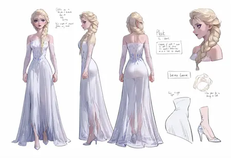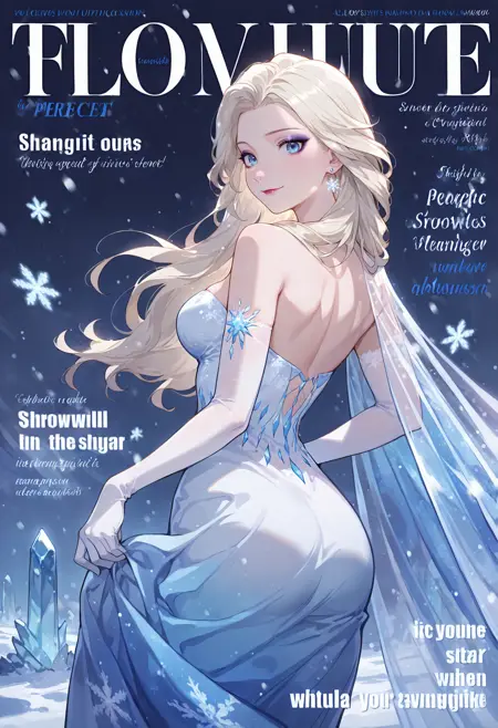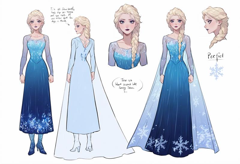 드레스, 어깨에 걸친 머리, 파란 드레스, 눈송이 무늬, 긴 드레스, 망토, 긴 소매, 부츠, 하이힐, 투명한 소재