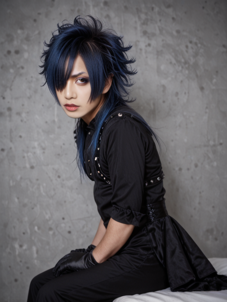 시각적 키(Visual Kei) 스타일을 구현하도록 설계된 모델. 헤어, 메이크업, 옷.